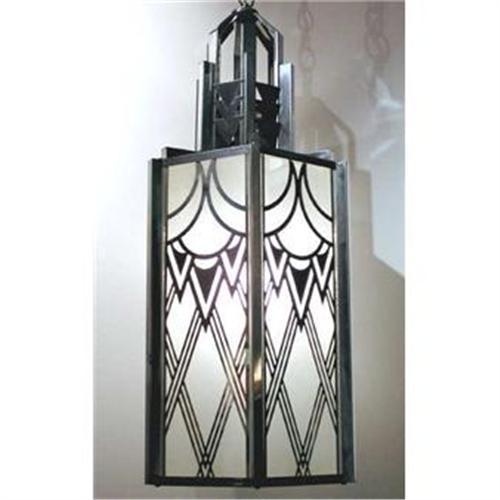 This vintage art deco ceiling lamp has its original frosted glass panels featuring a geometric pattern of triangles, curves and crossing lines. Above the six-sided lower section is an upper structure reminiscient of the Chrysler Building. Believed to be made from polished stainless steel. Measures 13" wide/deep and 28" high. Good working order. Some minor corrosion here and there, consistent with its age. This item resides in Chelsea in Manhattan ( New York City ) and may be seen by appointment. Thanks for visiting. Please let us know if you have any questions or comments.
