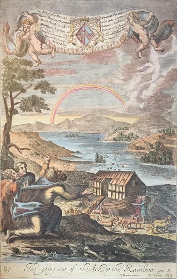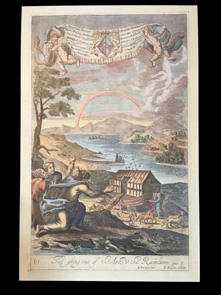 Modern, machine colored print of Noah's Ark. Created after an original antique print entitled, "The going out ofthe Ark, & the Rainbow." 10 1/2" X 16 1/2". Shrink - wrapped in the original packaging from a 1990's