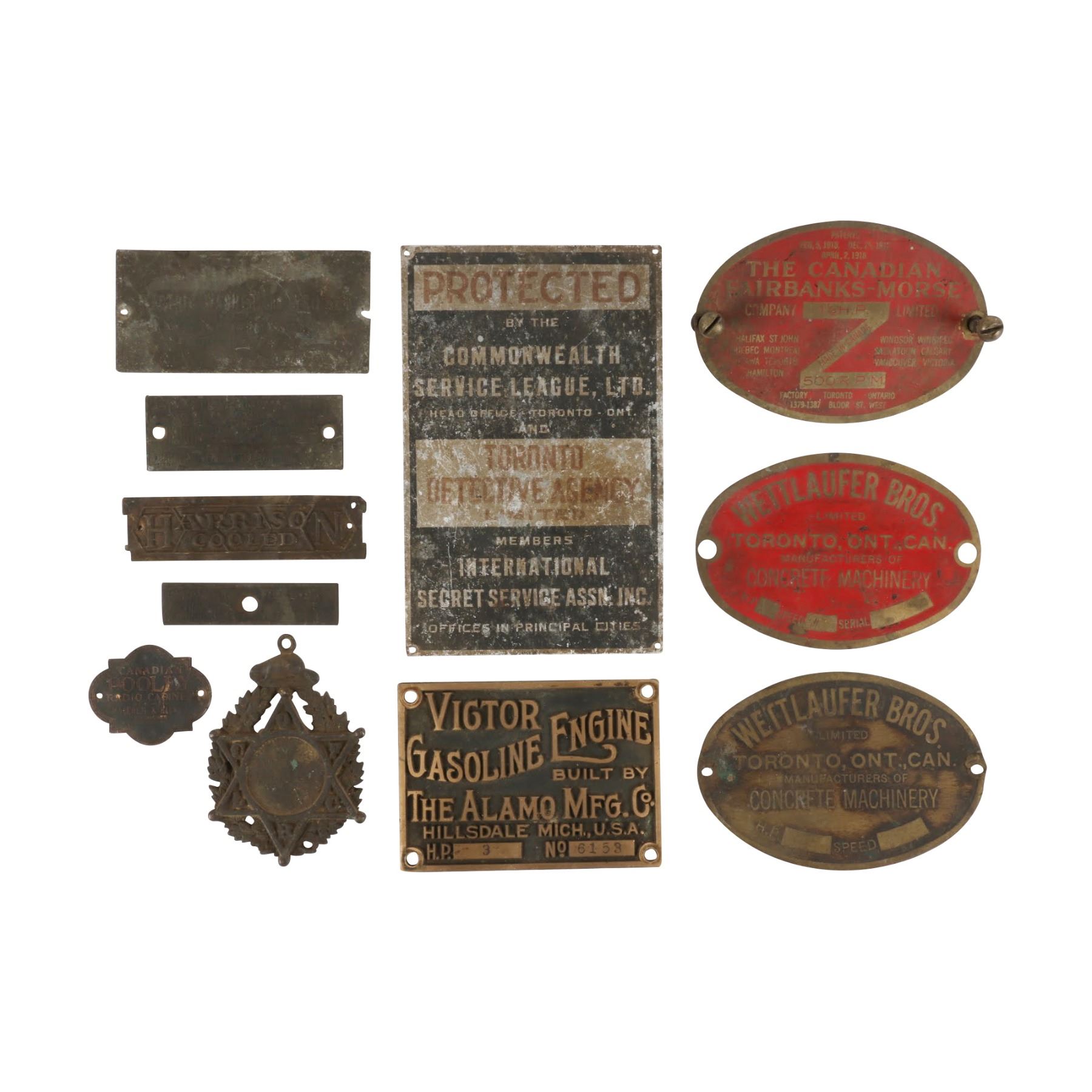 Mostly Canadian. Circa 1920s. Eleven (11) pieces. Toronto Detective Agency, Victor 3HP Gasoline Engine, Fairbanks-Morse, Wettlaufer Bros, Harrison, Pooley Etc. 1.5" to 4". Untouched original condition. $100-200.