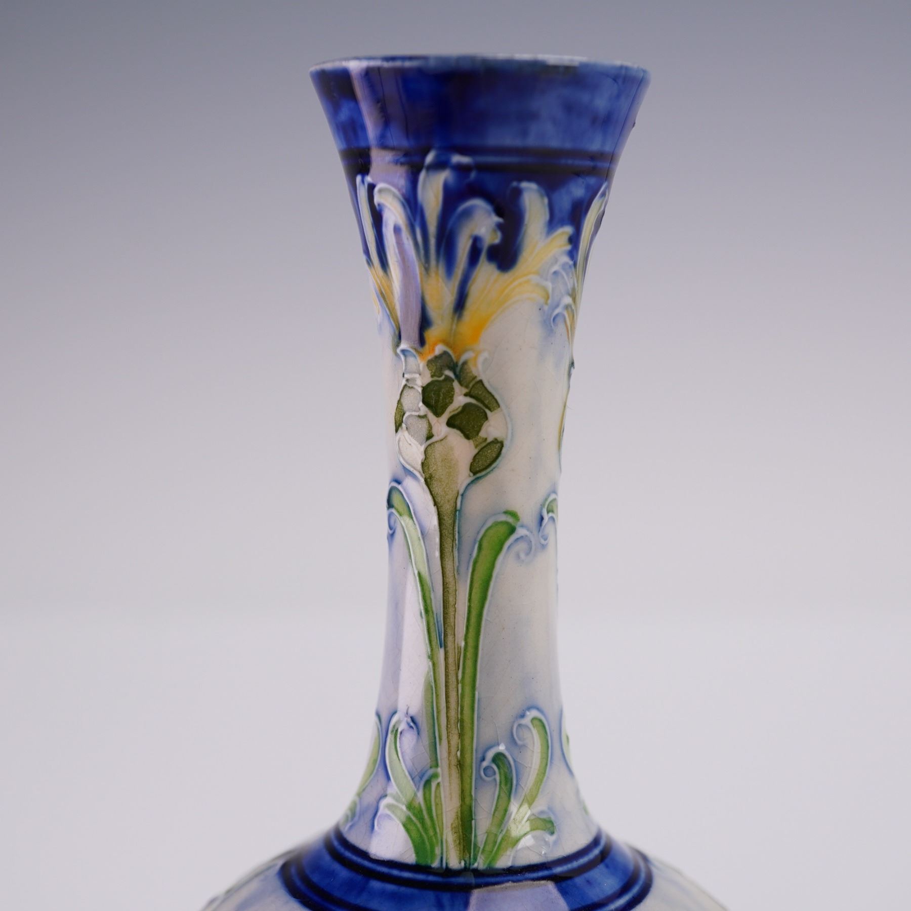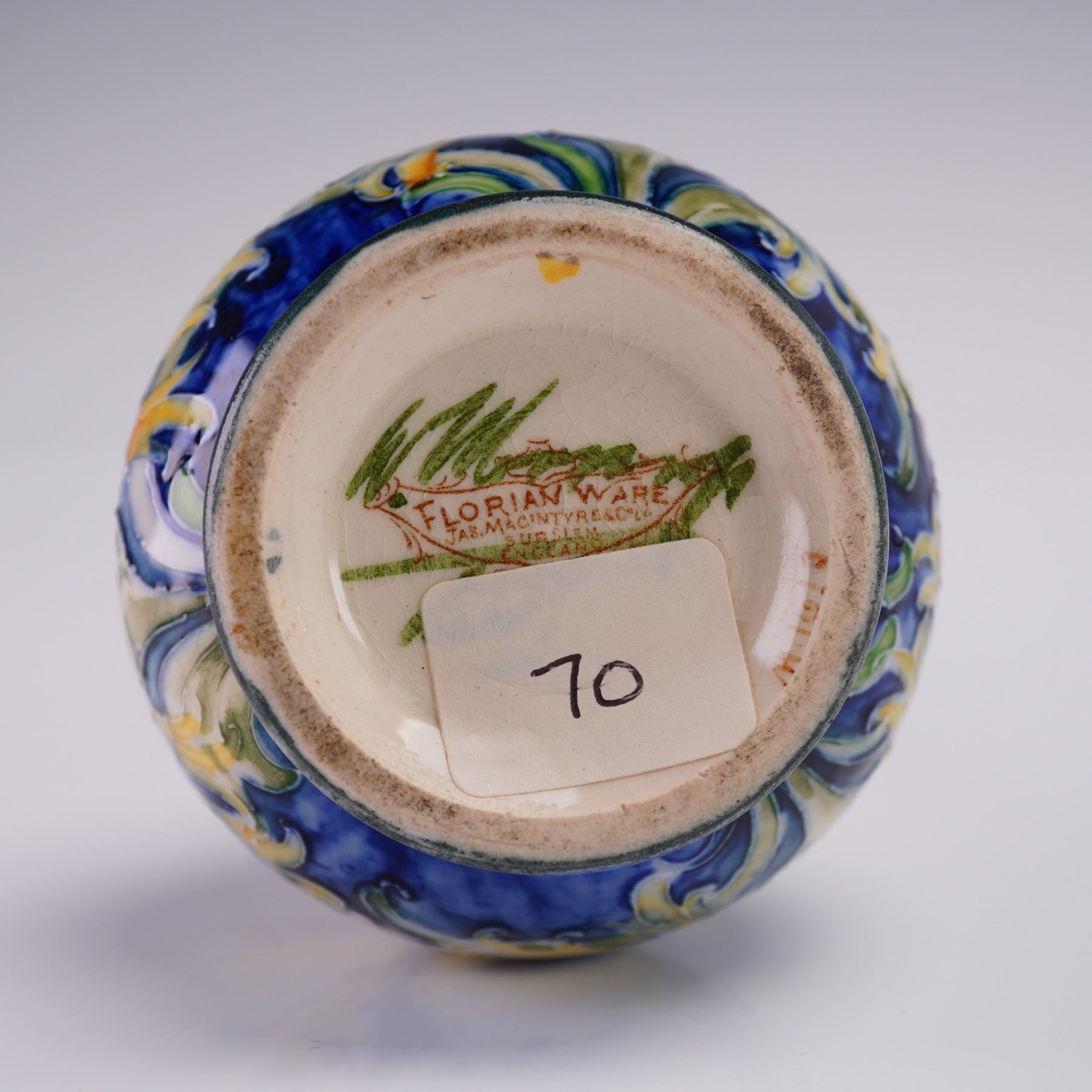 Small ceramic vase produced by James Macintyre & Co., featuring the early work of renowned designer William Moorcroft under the "Florian Ware" line. The bulbous body with slender neck is decorated in the Cornflower pattern, executed in tube-lined relief and hand-painted in shades of blue, yellow, green, and pale lilac against a cream ground. The base bears a brown printed Florian Ware mark reading "FLORIAN WARE JAS. MACINTYRE & CO. LTD BURSLEM ENGLAND" along with a green painted signature "W. Moorcroft."
