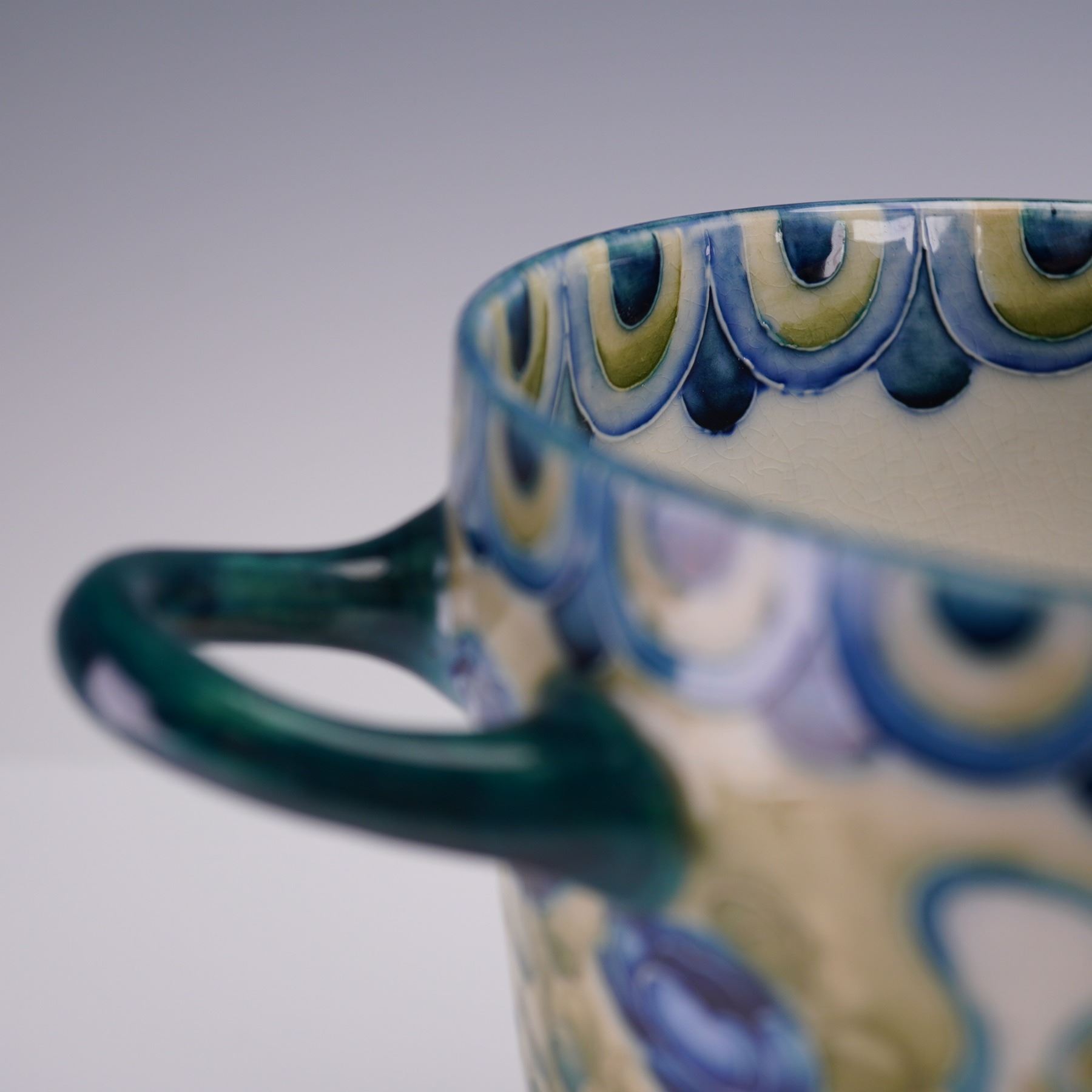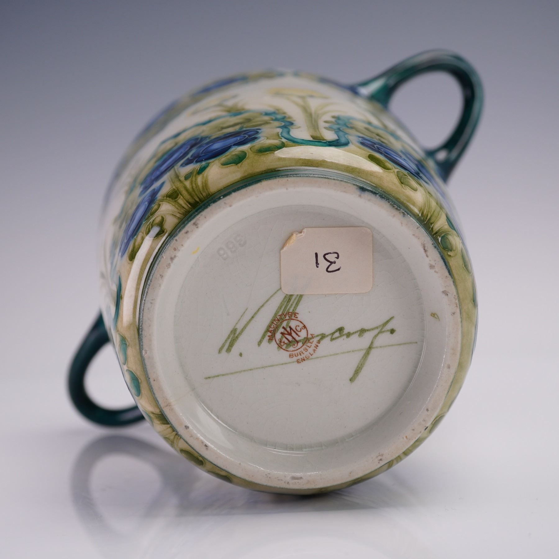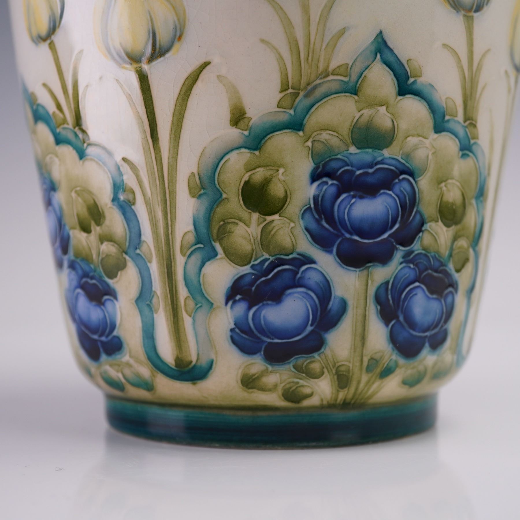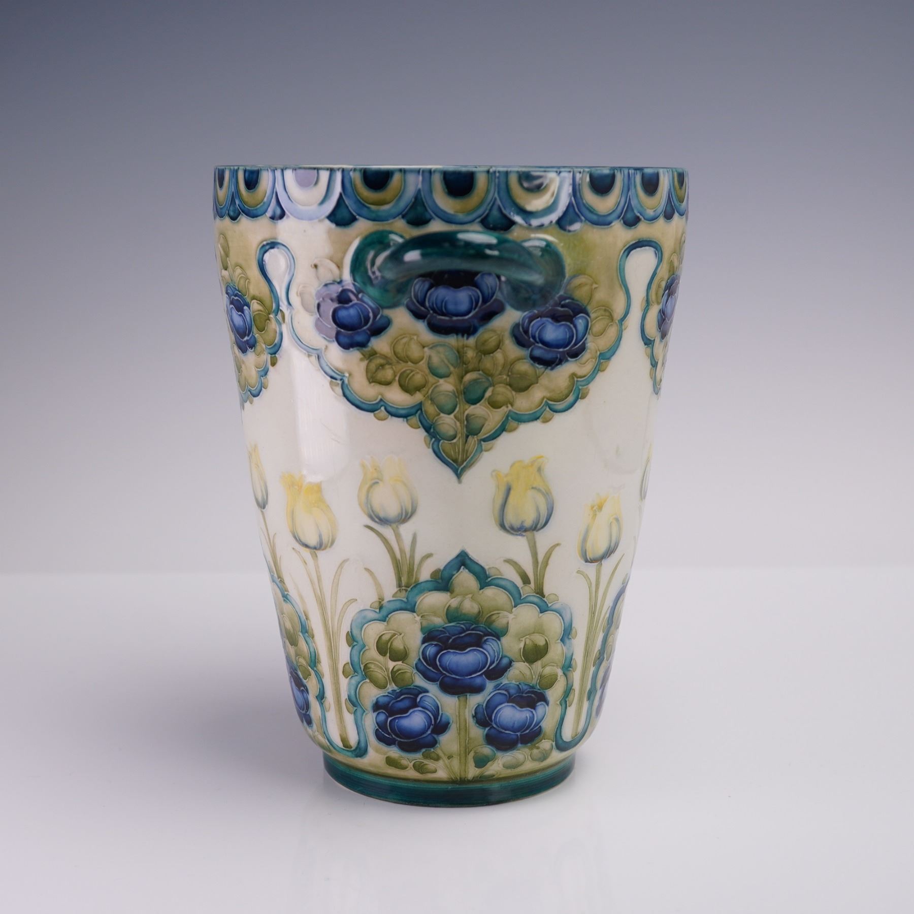 A Macintyre Moorcroft Florian Ware two-handled vase, featuring a tapering cylindrical form with applied loop handles on either side. The vase is decorated in a palette of cobalt blue, green, and pale yellow on a cream ground. The body is adorned with panels of stylized roses and tulips, framed within ornate borders and accented by vertical stems and buds. The floral motifs are executed in tubelining, a hallmark of the Florian Ware technique, with crisp detail and rich glaze application. The upper border exhibits a repeating pattern of fan-shaped petals in blue and green tones. The base bears the printed Macintyre & Co. Burslem mark in red and the green painted signature of William Moorcroft.