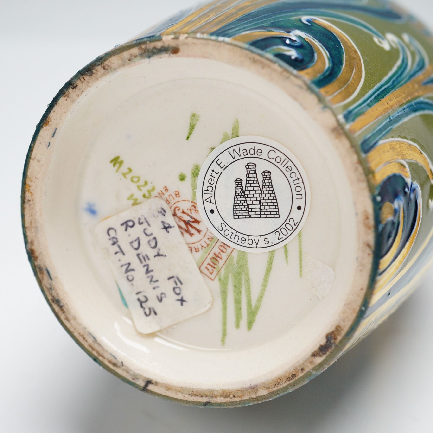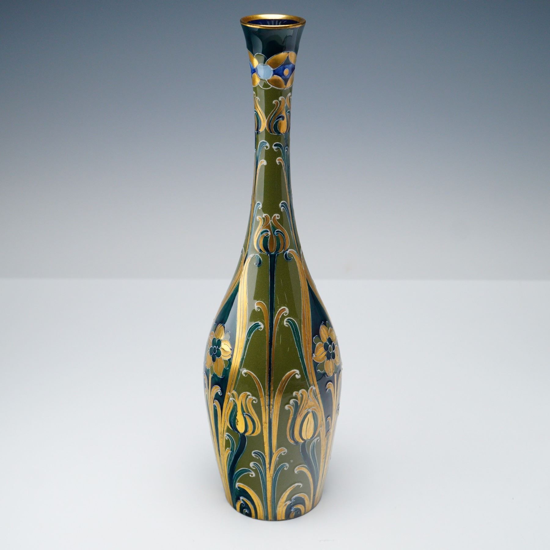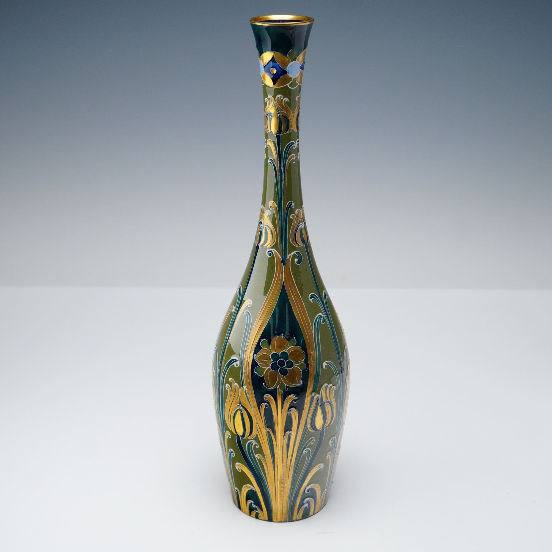 The vase is of elongated bottle-form with a slender neck and bulbous base. It is decorated in tubelined floral motifs featuring tulip and stylized flower patterns in green, cobalt blue, and gilt highlights. The interior of the mouth is finished in deep blue with a gilt rim. The underside bears Macintyre factory mark for James Macintyre & Co., Burslem, England, together with William Moorcroft's painted green signature, along with collection labels including 'Albert E. Wade Collection, Sotheby's 2002.'