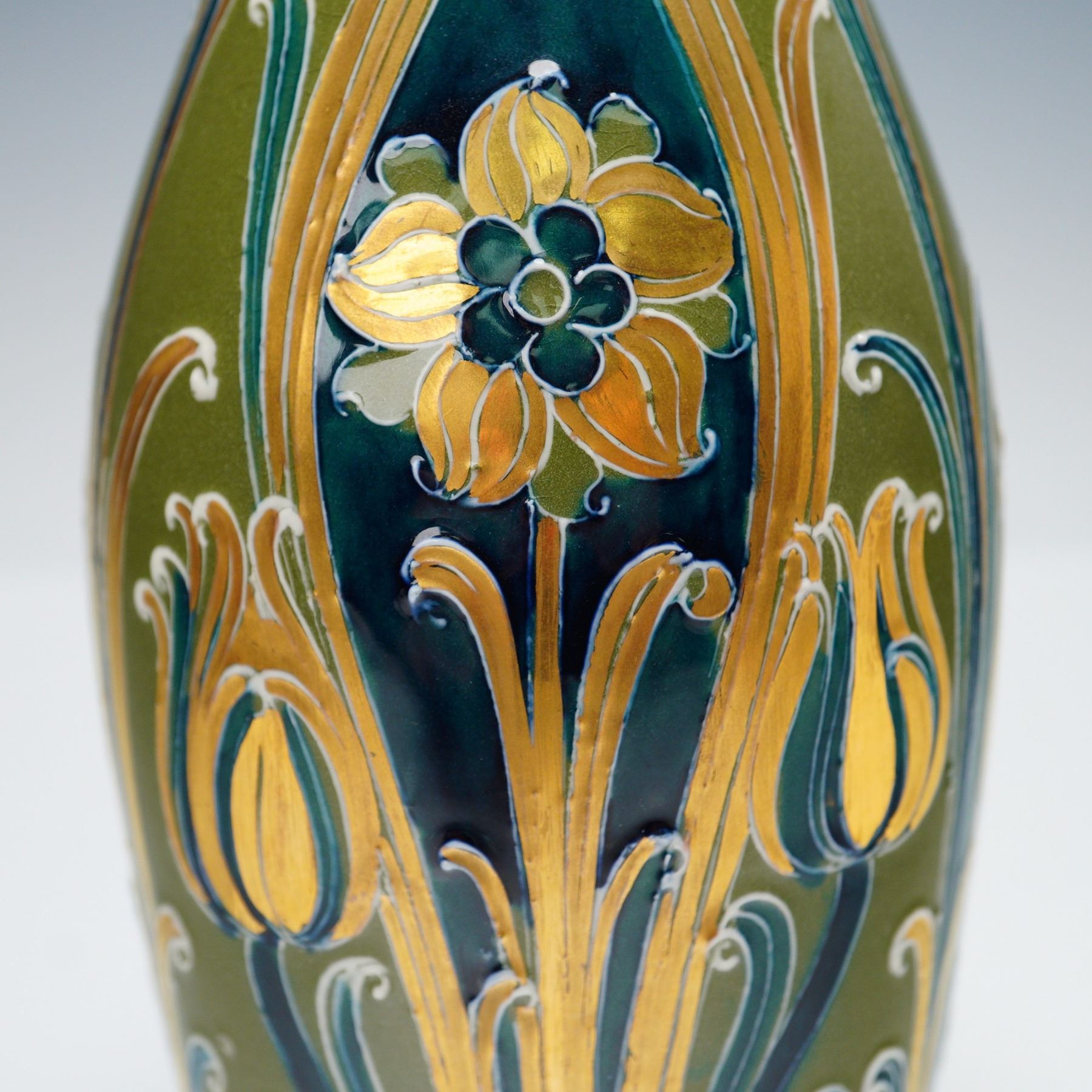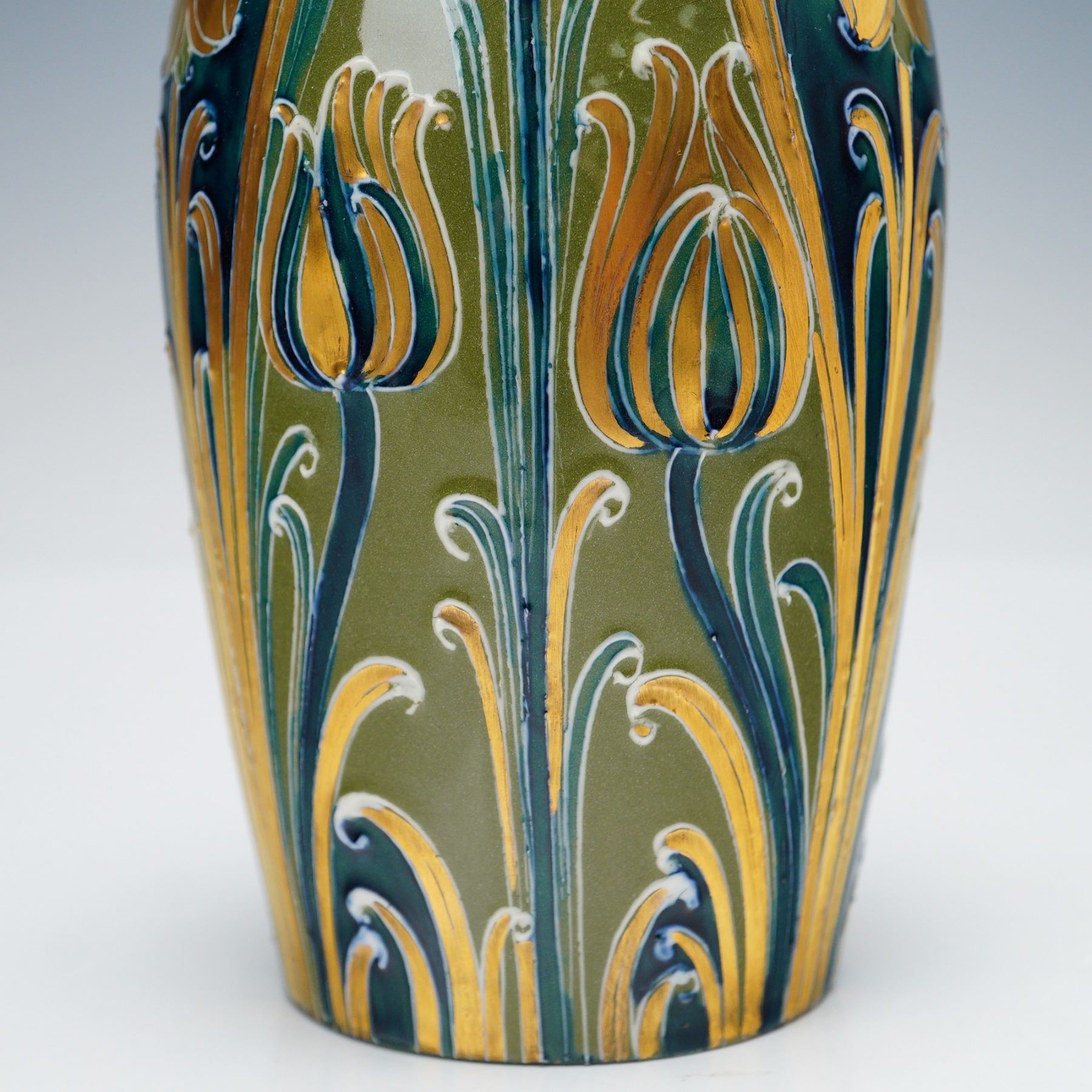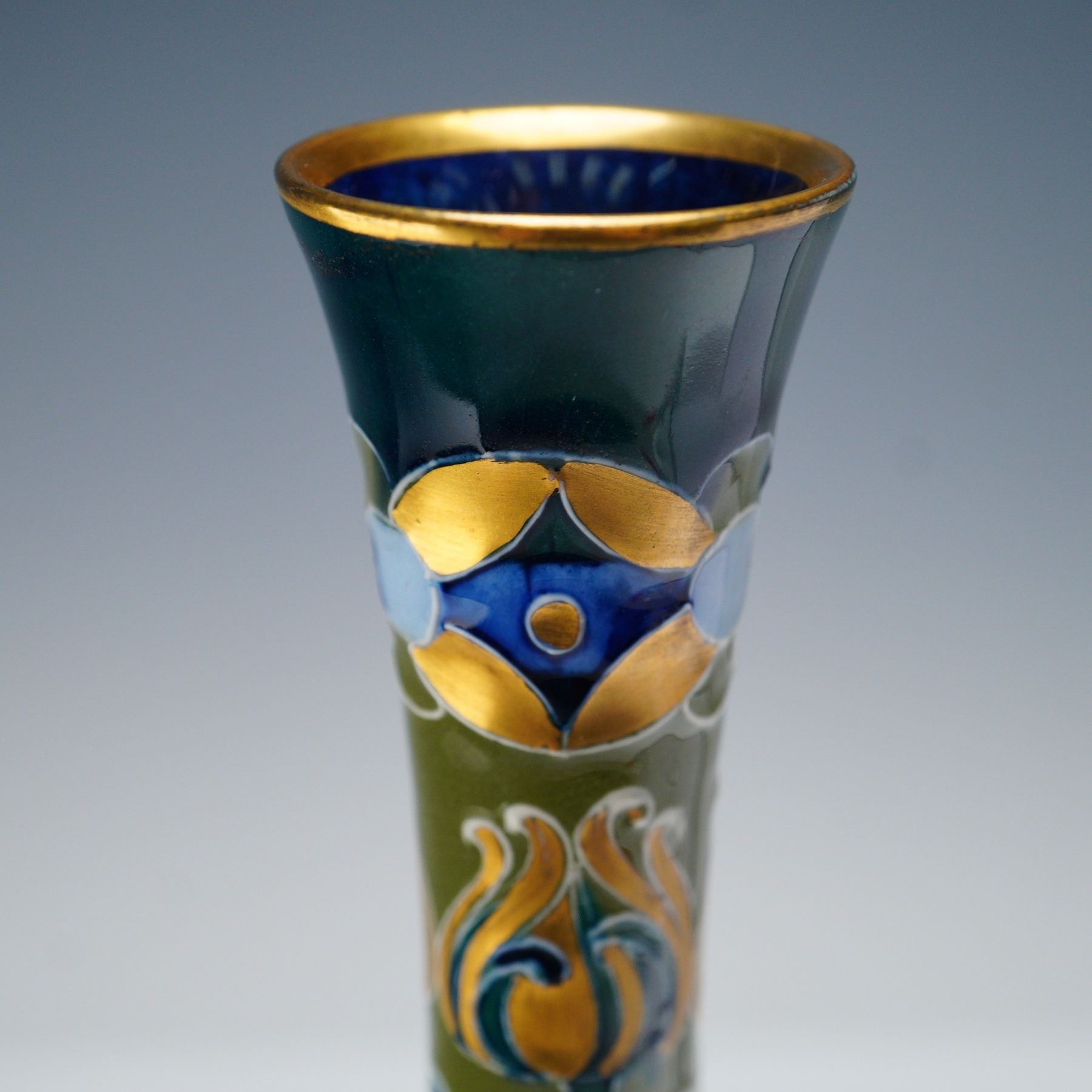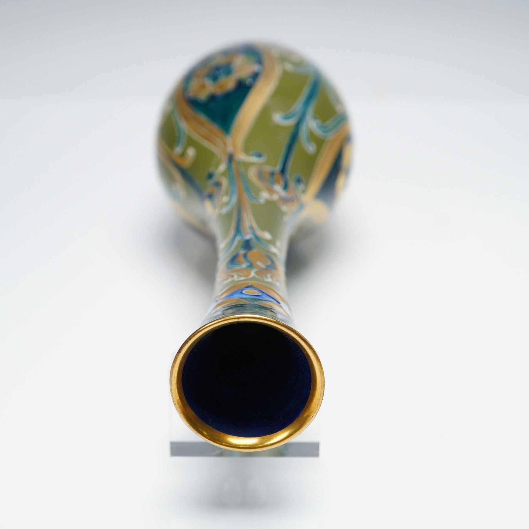 The vase is of elongated bottle-form with a slender neck and bulbous base. It is decorated in tubelined floral motifs featuring tulip and stylized flower patterns in green, cobalt blue, and gilt highlights. The interior of the mouth is finished in deep blue with a gilt rim. The underside bears Macintyre factory mark for James Macintyre & Co., Burslem, England, together with William Moorcroft's painted green signature, along with collection labels including 'Albert E. Wade Collection, Sotheby's 2002.'