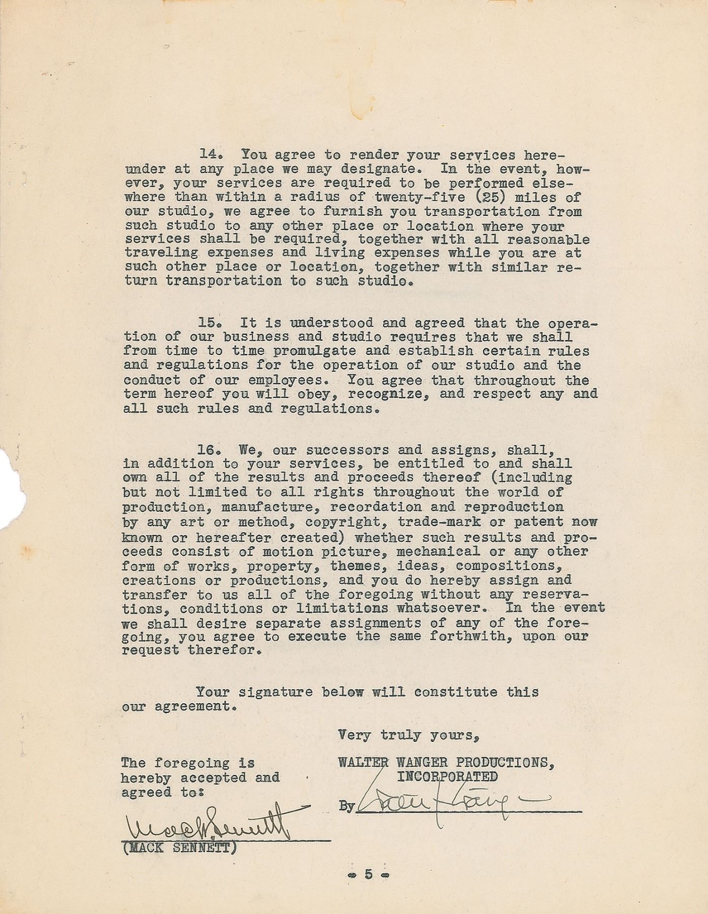 DS, five pages, 8.5 x 11, May 14, 1938. Agreement by which Walter Wanger hires Mack Sennett, in part: "We hereby employ you to render your exclusive services to us as a writer, to write, compose, and prepare…the treatment for a motion picture photoplay to be adapted from, and based upon, the play entitled 'The Illusionist' by Sacha Guitry." Crisply signed at the conclusion in fountain pen by both Wanger and Sennett. In very good to fine condition, with light creasing, faint staining to the top edges, last page detached, and an area of paper loss to the left edge of the final page. A scarce and desirable combination of filmmaking pioneers.