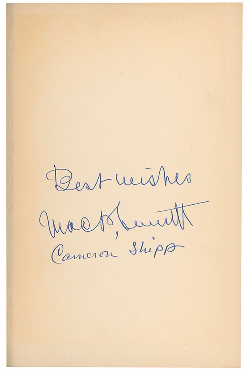 Signed book: King of Comedy. First edition. NY: Doubleday, 1957. Hardcover with dustjacket, 6 x 8.5, 284 pages. Signed on the first free-end page, “Best wishes, Mack Sennett,” and also signed by Cameron Shipp. Mild overall toning to signed page, as well as opening and closing pages and pastedowns, some light wear to boards, and scattered wear, toning, and creasing to dustjacket, as well as a bit of paper loss, otherwise fine condition.