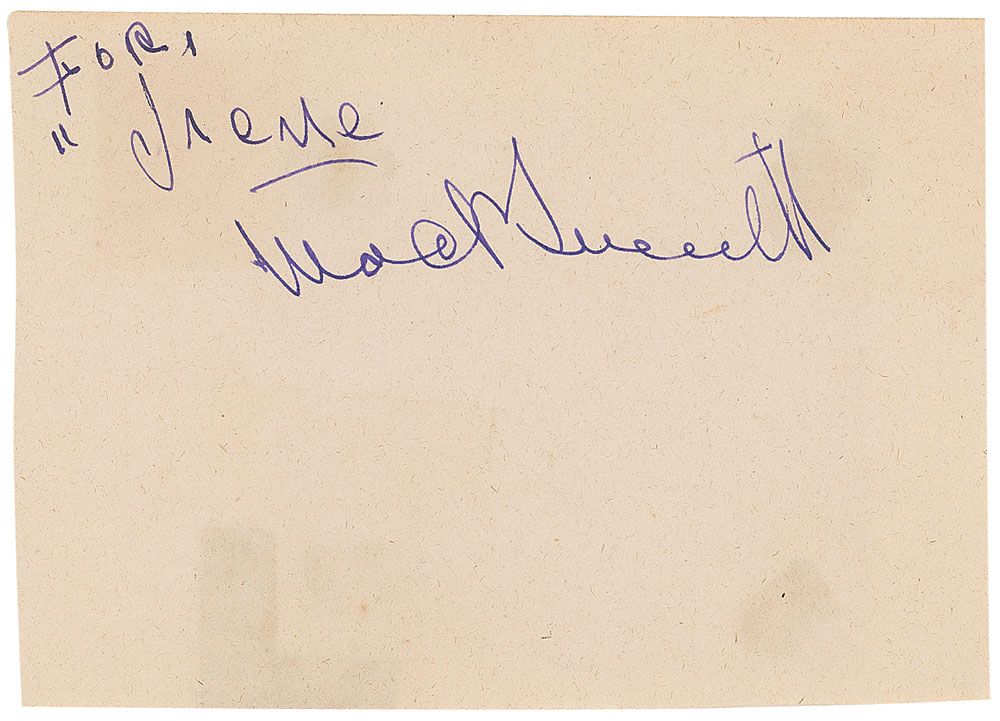 Vintage fountain pen signature and inscription, “For Irene, Mack Sennett,” on an off-white 5 x 3.5 album page. In fine condition, with a clipped signature affixed to reverse, as well as a couple spots of toning near bottom from adhesive on reverse.