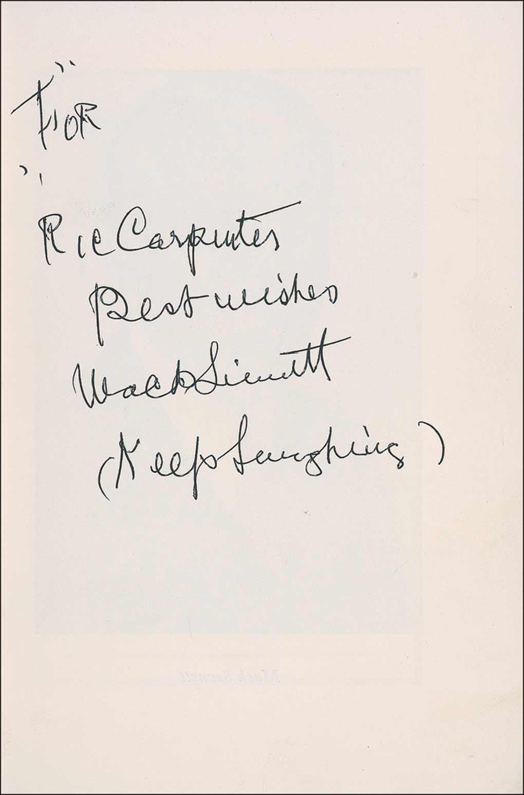 Pioneering filmmaker (1880–1960) who founded Keystone Studios and introduced to the public such screen legends as Fatty Arbuckle, Mack Swain, The Keystone Kops, and Charlie Chaplin. Signed book: Father Goose. First edition, first printing. NY: Covivi Friede, 1934. Hardcover, 6 x 8.5, 407 pages. Signed and inscribed on the reverse of his full-page photo before the title page, “For Ric Carpenter, Best wishes, Mack Sennett (Keep laughing).” Loose back hinge, moderately heavy sunning to spine, a bit of mild cover wear, and a few pencil notations to opening pages, otherwise fine condition.
