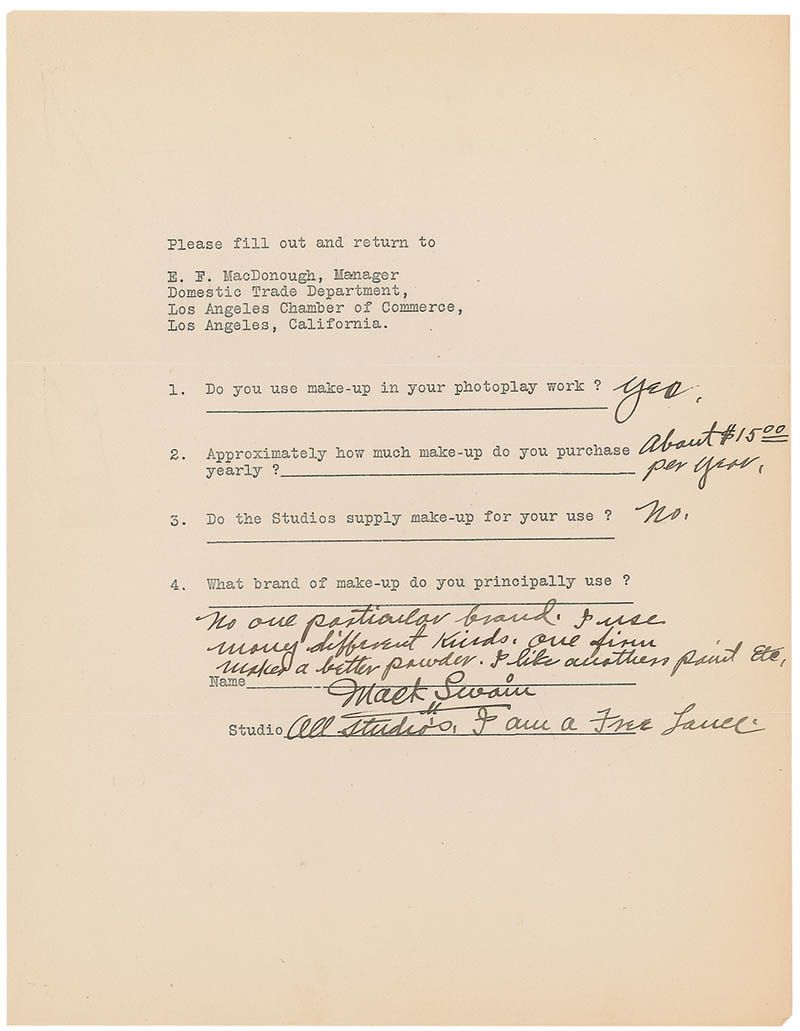 American actor and vaudevillian (1876–1935). DS, one page, 8.5 x 11, no date. Document submitted to the Los Angeles Chamber of Commerce, answering questions regarding use of makeup. Swain reports that he purchases “About $15.00 per year” of makeup and says he uses “No one particular brand…one firm makes a better powder. I like another paint etc.” In fine condition, with two horizontal folds and light toning.