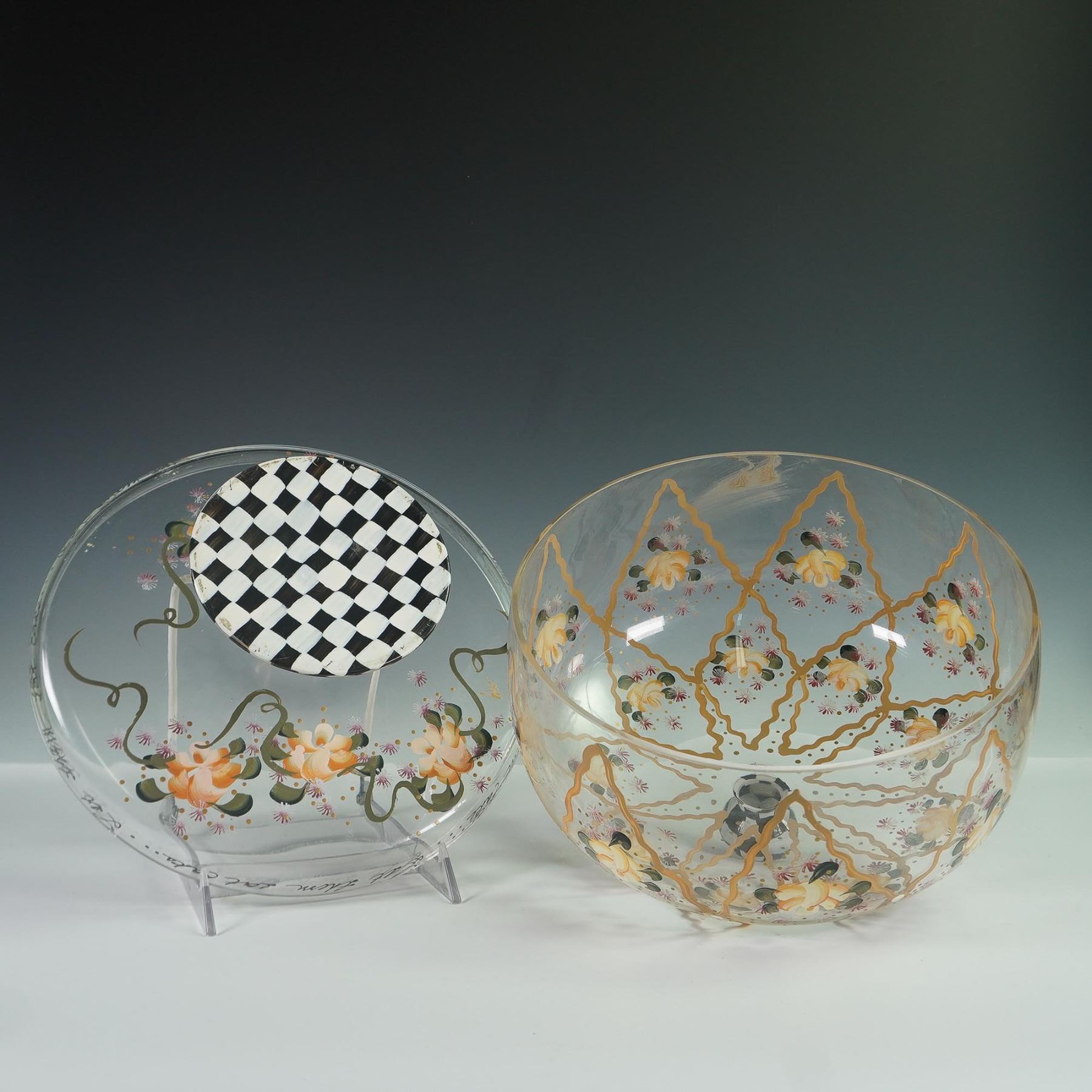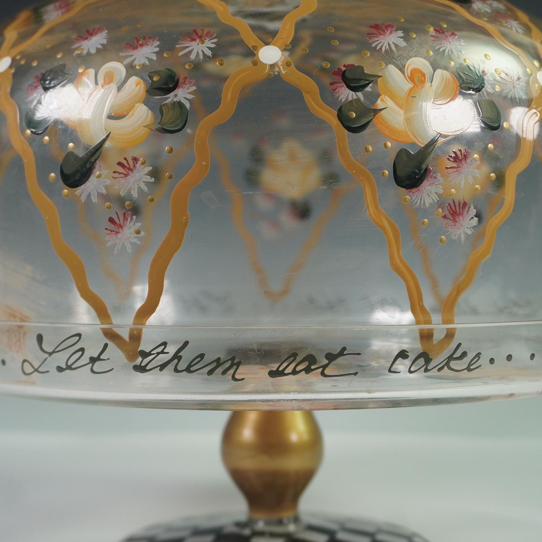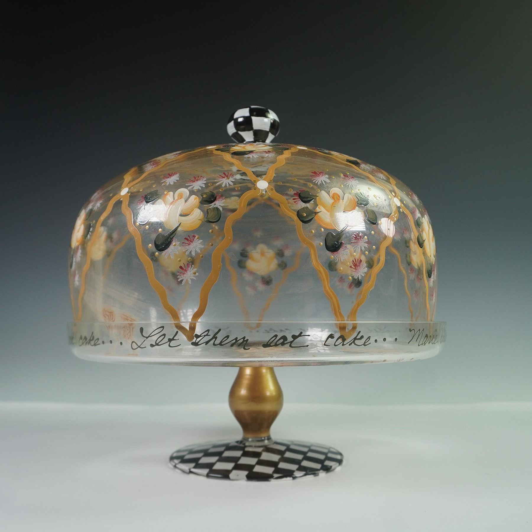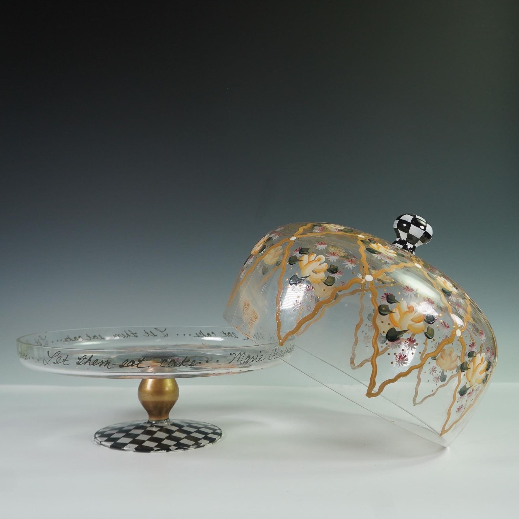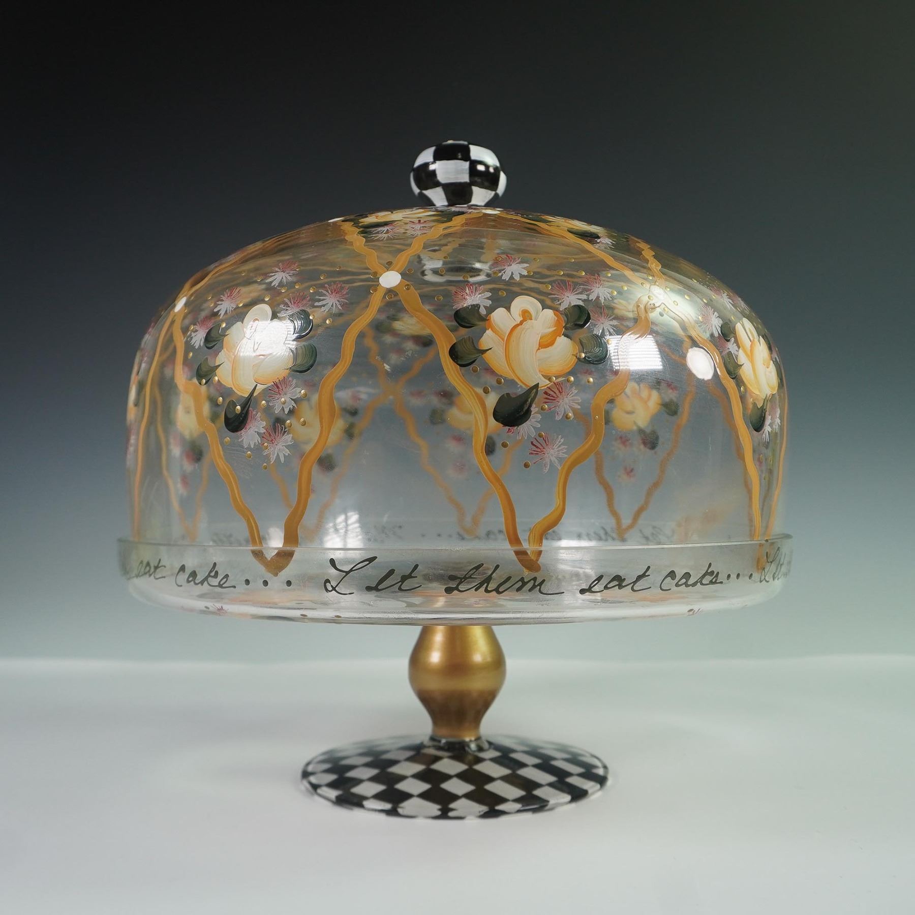 Decorative hand-painted glass cake stand with dome rendered by MacKenzie-Childs. The glass dome features a floral motif in yellow, white, and pink, framed by golden latticework and highlighted with green leaf accents. Around the rim is the scripted phrase Let them eat cake..., a playful nod to the famous saying by Marie Antoinette, 1789. The piece is topped with a black and white checkered finial and stands on a coordinating checkered base with a satin gold-tone stem. Unmarked. This piece captures the theatrical charm and colorful elegance associated with MacKenzie-Childs design.