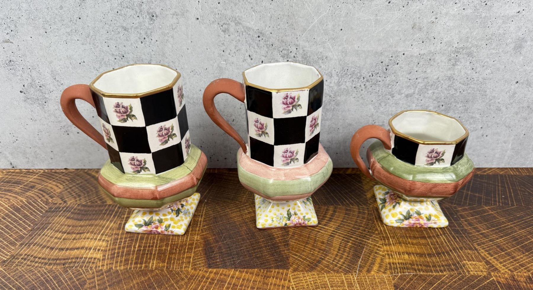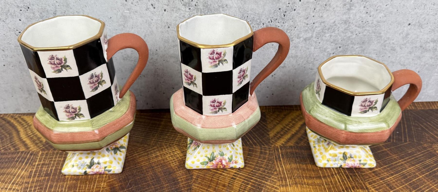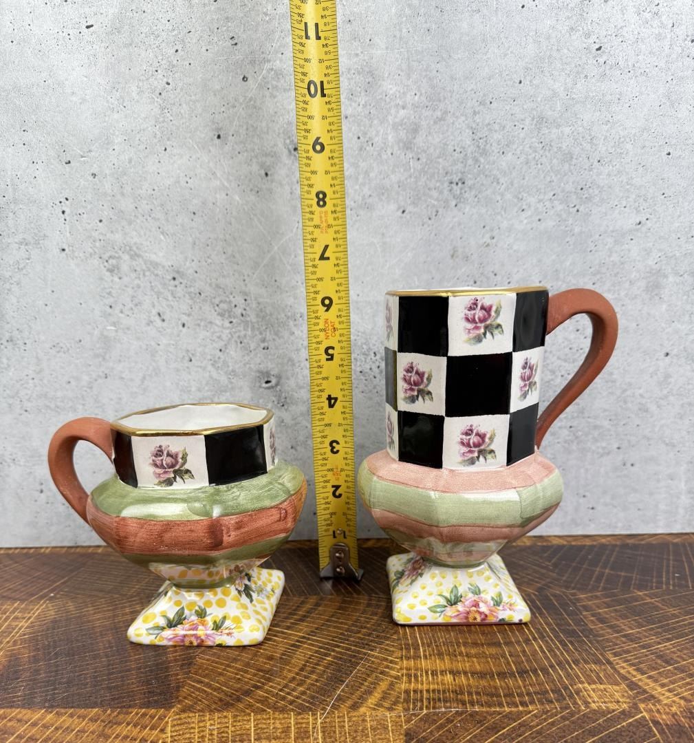 Taller cup is 6 1/4" tall, smaller cup is 4" tall