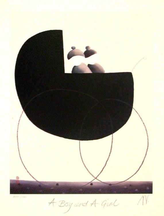 Artist: Mackenzie ThorpeTitle: A Boy and a GirlMedium: Lithograph on PaperOrientation: verticalImage Size: 9.5 x 12 inchesPaper Size: 13.25 x 15.5 inchesEdition Size: 200: Signed by the artist, individually numbered, accompanied by certificate of authenticity signed by the publisher.BiographyInternationally renowned artist Mackenzie Thorpe was raised in the industrial town of Middlesbrough in the 1950s, where his father worked as a laborer and his mother as an auxiliary nurse. Mackenzie acknowledges mixed emotions about this period in his life. He remembers the strong feeling of community spirit, the warmth and humor that flourished in the face of adversity, as well as the loneliness and isolation. The need and compulsion to draw was obvious from an early age and remains with Mackenzie today. As a child, he would seek out whatever raw materials he could find, drawing on cigarette packs with stubs of pencils, or using eye-shadow and lipstick illicitly obtained from his mum's makeup bag. Struggling with dyslexia throughout his childhood, Mackenzie found confidence in painting and drawing. Unsurprisingly, he left school without formal qualifications, taking on a variety of manual, unskilled jobs while continuing to draw and paint. Mackenzie eventually got the courage to enter the local art college. His lack of education and a barely readable application did nothing to warrant support, but the strength and volume of work that Mackenzie presented, coupled with his enthusiasm and commitment, won him a place at the Middlesbrough College of Art and, subsequently, the Byam Shaw School of Art in London. After leaving art school, he spent several years working with inner-city children in London before moving to North Yorkshire to set up a studio and gallery with his wife, Susan, and children, Owen and Chloe. Since then, he has become one today's most collected and sought-after artists. His works express an entire range of human emotion, from the special bond of love and friendship, to the importance of self-reflection and individual triumphs. His works are a tribute to the creativity within us all and are a vivid expression of hope and the human spirit. Mackenzie's perspective on life is clear. He doesn't hide the fact that often life is a struggle, a dark tunnel which can seem endless. However, he passionately believes that our frail dreams are worth nurturing and that love and honesty will triumph over adversity.