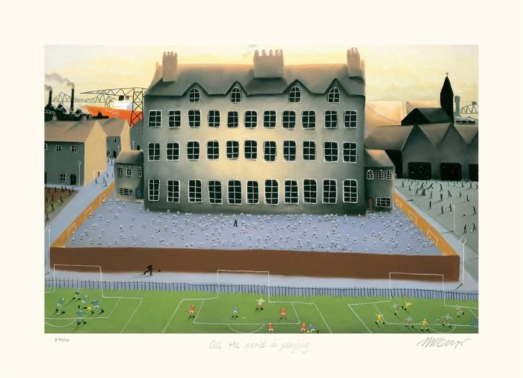 Artist: Mackenzie Thorpe Title: All the World is Playing Medium: Lithograph on Paper Orientation: horizontal Image Size: 22 x 14.75 inches Paper Size: 26 x 19.5 inches Edition Size: 100 : Signed by the artist, individually numbered, accompanied by certificate of authenticity signed by the publisher.BiographyInternationally renowned artist Mackenzie Thorpe was raised in the industrial town of Middlesbrough in the 1950s, where his father worked as a laborer and his mother as an auxiliary nurse. Mackenzie acknowledges mixed emotions about this period in his life. He remembers the strong feeling of community spirit, the warmth and humor that flourished in the face of adversity, as well as the loneliness and isolation. The need and compulsion to draw was obvious from an early age and remains with Mackenzie today. As a child, he would seek out whatever raw materials he could find, drawing on cigarette packs with stubs of pencils, or using eye-shadow and lipstick illicitly obtained from his mum's makeup bag. Struggling with dyslexia throughout his childhood, Mackenzie found confidence in painting and drawing. Unsurprisingly, he left school without formal qualifications, taking on a variety of manual, unskilled jobs while continuing to draw and paint. Mackenzie eventually got the courage to enter the local art college. His lack of education and a barely readable application did nothing to warrant support, but the strength and volume of work that Mackenzie presented, coupled with his enthusiasm and commitment, won him a place at the Middlesbrough College of Art and, subsequently, the Byam Shaw School of Art in London. After leaving art school, he spent several years working with inner-city children in London before moving to North Yorkshire to set up a studio and gallery with his wife, Susan, and children, Owen and Chloe. Since then, he has become one today's most collected and sought-after artists. His works express an entire range of human emotion, from the special bond of love and friendship, to the importance of self-reflection and individual triumphs. His works are a tribute to the creativity within us all and are a vivid expression of hope and the human spirit. Mackenzie's perspective on life is clear. He doesn't hide the fact that often life is a struggle, a dark tunnel which can seem endless. However, he passionately believes that our frail dreams are worth nurturing and that love and honesty will triumph over adversity.