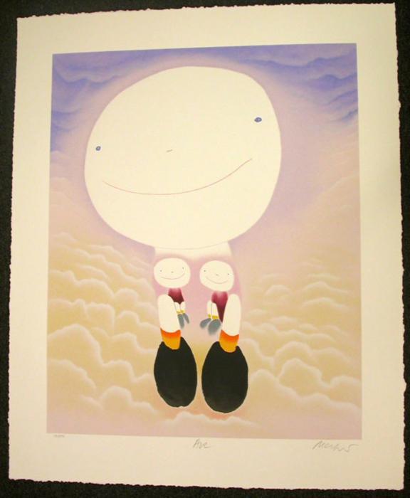 Artist: Mackenzie Thorpe Title: Ave Medium: Serigraph on Paper Image: 30" x 24" Paper: 36.5" x 30" Edition: 395 Arabic BiographyInternationally renowned artist Mackenzie Thorpe was raised in the industrial town of Middlesbrough in the 1950s, where his father worked as a laborer and his mother as an auxiliary nurse. Mackenzie acknowledges mixed emotions about this period in his life. He remembers the strong feeling of community spirit, the warmth and humor that flourished in the face of adversity, as well as the loneliness and isolation. The need and compulsion to draw was obvious from an early age and remains with Mackenzie today. As a child, he would seek out whatever raw materials he could find, drawing on cigarette packs with stubs of pencils, or using eye-shadow and lipstick illicitly obtained from his mum's makeup bag. Struggling with dyslexia throughout his childhood, Mackenzie found confidence in painting and drawing. Unsurprisingly, he left school without formal qualifications, taking on a variety of manual, unskilled jobs while continuing to draw and paint. Mackenzie eventually got the courage to enter the local art college. His lack of education and a barely readable application did nothing to warrant support, but the strength and volume of work that Mackenzie presented, coupled with his enthusiasm and commitment, won him a place at the Middlesbrough College of Art and, subsequently, the Byam Shaw School of Art in London. After leaving art school, he spent several years working with inner-city children in London before moving to North Yorkshire to set up a studio and gallery with his wife, Susan, and children, Owen and Chloe. Since then, he has become one today's most collected and sought-after artists. His works express an entire range of human emotion, from the special bond of love and friendship, to the importance of self-reflection and individual triumphs. His works are a tribute to the creativity within us all and are a vivid expression of hope and the human spirit. Mackenzie's perspective on life is clear. He doesn't hide the fact that often life is a struggle, a dark tunnel which can seem endless. However, he passionately believes that our frail dreams are worth nurturing and that love and honesty will triumph over adversity.