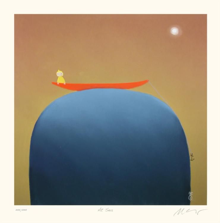 Artist: Mackenzie Thorpe Title: At Sea Medium: Serigraph on paper Orientation: vertical Image size: 30 x 30 inches Paper size: 36 x 37 inches Edition size: 195 This hand-pulled serigraph was printed on 100% cotton rag paper and was created with exceptional fine art craftsmanship. It has been hand-signed and hand-titled by the artist and is accompanied by a certificate of authenticity, signed by the publisher. BiographyInternationally renowned artist Mackenzie Thorpe was raised in the industrial town of Middlesbrough in the 1950s. Struggling from dyslexia throughout his childhood, Mackenzie found confidence in painting and drawing and eventually summoned the courage to go to art school. After leaving art school, he spent several years working with inner-city children in London before moving to North Yorkshire to set up a studio, as well as his own gallery. Since then, he has become one of the world's most collected and sought-after artists. His art works have been exhibited in museums and galleries across 4 continents.About the Artist - "My ambition is to unite the world through the eyes of these children and let today's cultures understand that in order to sustain our societies, we must protect and nurture our children, and also protect and nurture the child within us all. It is our responsibility to love these children, to let them bring love back to the world, and to keep our eyes open to the wonderment of childhood." - Mackenzie Thorpe