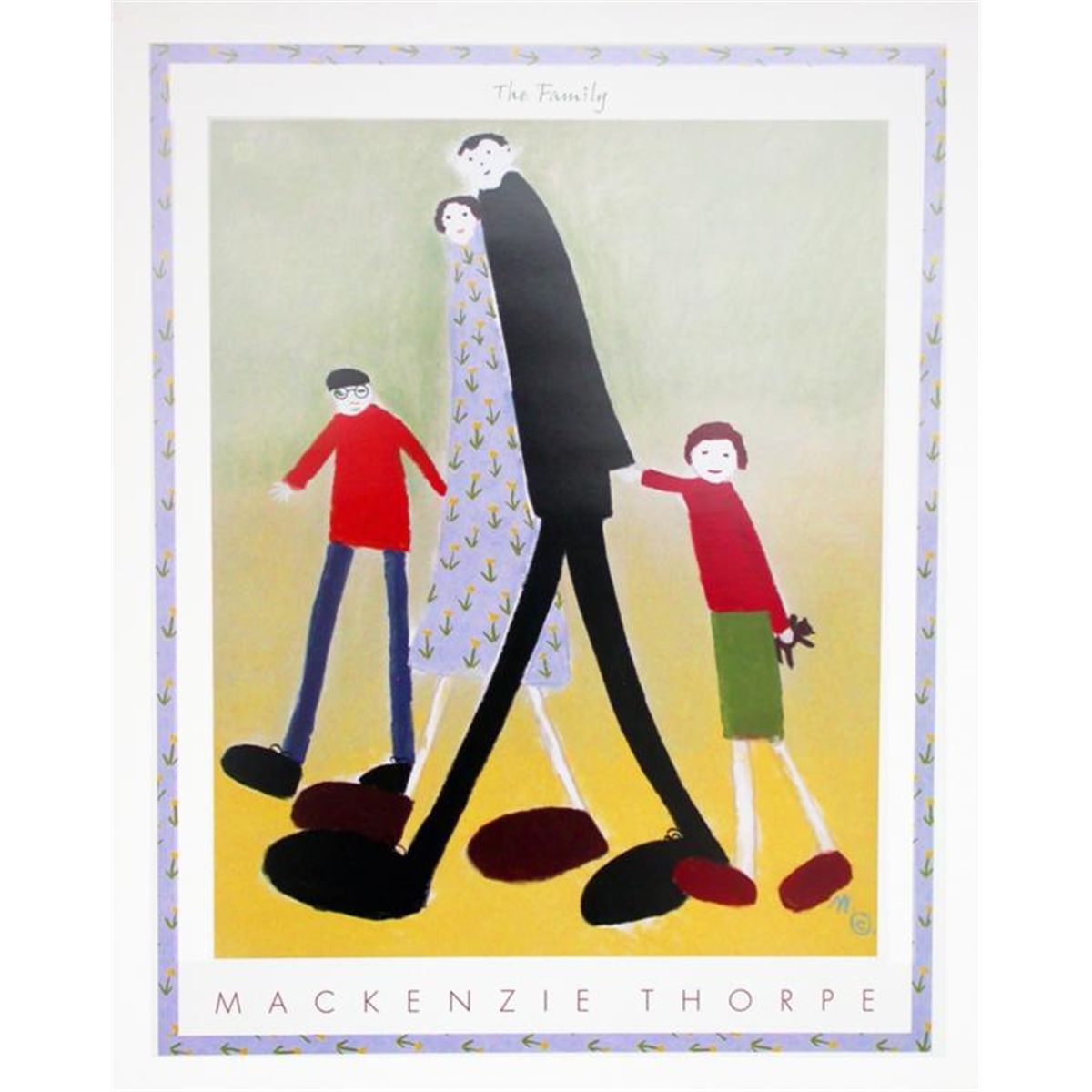 Artist: Mackenzie ThorpeTitle: FamilyMedium: Lithograph on PaperOrientation: verticalImage Size: 14 x 18 inchesPaper Size: 16 x 20 inchesEdition Size: open: Biography * Internationally renowned artist Mackenzie Thorpe was raised in the industrial town of Middlesbrough in the 1950s, where his father worked as a laborer and his mother as an auxiliary nurse. Mackenzie acknowledges mixed emotions about this period in his life. He remembers the strong feeling of community spirit, the warmth and humor that flourished in the face of adversity, as well as the loneliness and isolation. * The need and compulsion to draw was obvious from an early age and remains with Mackenzie today. As a child, he would seek out whatever raw materials he could find, drawing on cigarette packs with stubs of pencils, or using eye-shadow and lipstick illicitly obtained from his mum's makeup bag. Struggling with dyslexia throughout his childhood, Mackenzie found confidence in painting and drawing. Unsurprisingly, he left school without formal qualifications, taking on a variety of manual, unskilled jobs while continuing to draw and paint. Mackenzie eventually got the courage to enter the local art college. His lack of education and a barely readable application did nothing to warrant support, but the strength and volume of work that Mackenzie presented, coupled with his enthusiasm and commitment, won him a place at the Middlesbrough College of Art and, subsequently, the Byam Shaw School of Art in London. * After leaving art school, he spent several years working with inner-city children in London before moving to North Yorkshire to set up a studio and gallery with his wife, Susan, and children, Owen and Chloe. Since then, he has become one today's most collected and sought-after artists. His works express an entire range of human emotion, from the special bond of love and friendship, to the importance of self-reflection and individual triumphs. His works are a tribute to the creativity within us all and are a vivid expression of hope and the human spirit. * Mackenzie's perspective on life is clear. He doesn't hide the fact that often life is a struggle, a dark tunnel which can seem endless. However, he passionately believes that our frail dreams are worth nurturing and that love and honesty will triumph over adversity. *