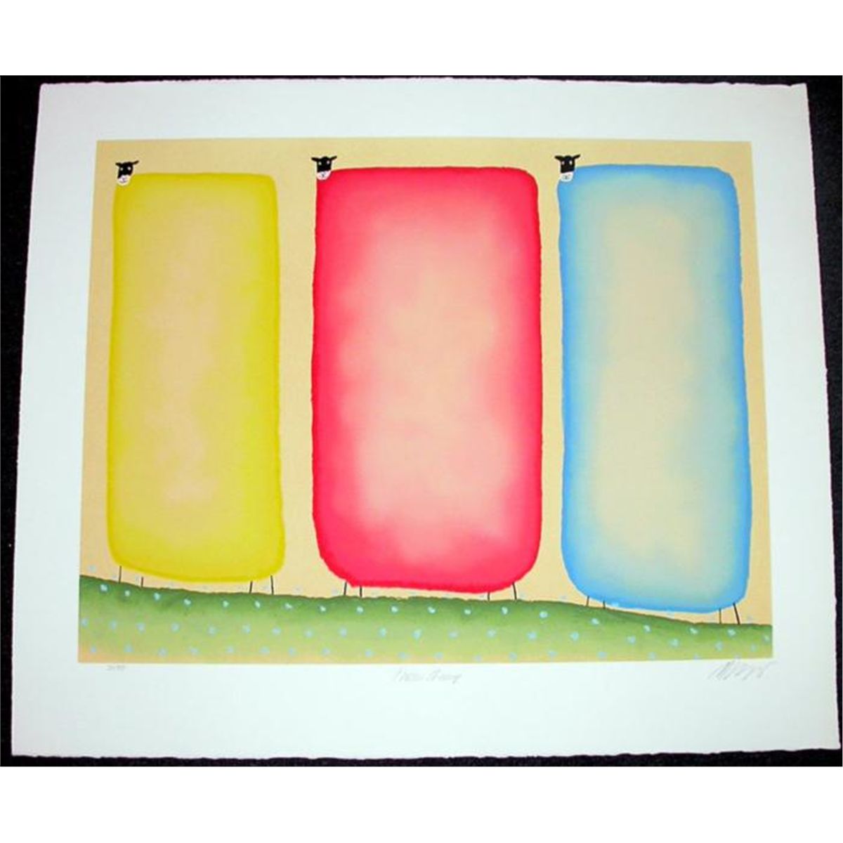 Artist: Mackenzie Thorpe Title: Hope, Love and Joy (Three Sheep)Medium: Serigraph on Paper Image: 23.25 x 29.75 Paper: 29.25 x 35.32 Edition: 395 Arabic Biography * Internationally renowned artist Mackenzie Thorpe was raised in the industrial town of Middlesbrough in the 1950s, where his father worked as a laborer and his mother as an auxiliary nurse. Mackenzie acknowledges mixed emotions about this period in his life. He remembers the strong feeling of community spirit, the warmth and humor that flourished in the face of adversity, as well as the loneliness and isolation. * The need and compulsion to draw was obvious from an early age and remains with Mackenzie today. As a child, he would seek out whatever raw materials he could find, drawing on cigarette packs with stubs of pencils, or using eye-shadow and lipstick illicitly obtained from his mum's makeup bag. Struggling with dyslexia throughout his childhood, Mackenzie found confidence in painting and drawing. Unsurprisingly, he left school without formal qualifications, taking on a variety of manual, unskilled jobs while continuing to draw and paint. Mackenzie eventually got the courage to enter the local art college. His lack of education and a barely readable application did nothing to warrant support, but the strength and volume of work that Mackenzie presented, coupled with his enthusiasm and commitment, won him a place at the Middlesbrough College of Art and, subsequently, the Byam Shaw School of Art in London. * After leaving art school, he spent several years working with inner-city children in London before moving to North Yorkshire to set up a studio and gallery with his wife, Susan, and children, Owen and Chloe. Since then, he has become one today's most collected and sought-after artists. His works express an entire range of human emotion, from the special bond of love and friendship, to the importance of self-reflection and individual triumphs. His works are a tribute to the creativity within us all and are a vivid expression of hope and the human spirit. * Mackenzie's perspective on life is clear. He doesn't hide the fact that often life is a struggle, a dark tunnel which can seem endless. However, he passionately believes that our frail dreams are worth nurturing and that love and honesty will triumph over adversity. *