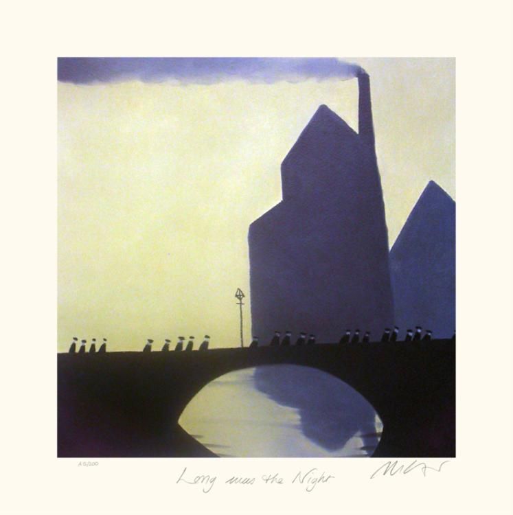 Artist: Mackenzie ThorpeTitle: Long was the NightMedium: Lithograph on PaperOrientation: verticalImage Size: 14 x 14 inchesPaper Size: 17 x 18 inchesEdition Size: 200: Signed by the artist, individually numbered, accompanied by certificate of authenticity signed by the publisher.Biography * Internationally renowned artist Mackenzie Thorpe was raised in the industrial town of Middlesbrough in the 1950s, where his father worked as a laborer and his mother as an auxiliary nurse. Mackenzie acknowledges mixed emotions about this period in his life. He remembers the strong feeling of community spirit, the warmth and humor that flourished in the face of adversity, as well as the loneliness and isolation. * The need and compulsion to draw was obvious from an early age and remains with Mackenzie today. As a child, he would seek out whatever raw materials he could find, drawing on cigarette packs with stubs of pencils, or using eye-shadow and lipstick illicitly obtained from his mum's makeup bag. Struggling with dyslexia throughout his childhood, Mackenzie found confidence in painting and drawing. Unsurprisingly, he left school without formal qualifications, taking on a variety of manual, unskilled jobs while continuing to draw and paint. Mackenzie eventually got the courage to enter the local art college. His lack of education and a barely readable application did nothing to warrant support, but the strength and volume of work that Mackenzie presented, coupled with his enthusiasm and commitment, won him a place at the Middlesbrough College of Art and, subsequently, the Byam Shaw School of Art in London. * After leaving art school, he spent several years working with inner-city children in London before moving to North Yorkshire to set up a studio and gallery with his wife, Susan, and children, Owen and Chloe. Since then, he has become one today's most collected and sought-after artists. His works express an entire range of human emotion, from the special bond of love and friendship, to the importance of self-reflection and individual triumphs. His works are a tribute to the creativity within us all and are a vivid expression of hope and the human spirit. * Mackenzie's perspective on life is clear. He doesn't hide the fact that often life is a struggle, a dark tunnel which can seem endless. However, he passionately believes that our frail dreams are worth nurturing and that love and honesty will triumph over adversity. *