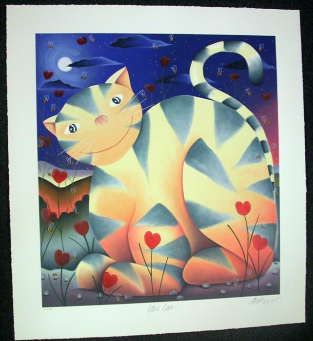 Artist: Mackenzie Thorpe Title: Love Cat Medium: Serigraph on Paper Image: 30" x 27" Paper: 36.5" x 33" Edition: 395 Arabic BiographyInternationally renowned artist Mackenzie Thorpe was raised in the industrial town of Middlesbrough in the 1950s, where his father worked as a laborer and his mother as an auxiliary nurse. Mackenzie acknowledges mixed emotions about this period in his life. He remembers the strong feeling of community spirit, the warmth and humor that flourished in the face of adversity, as well as the loneliness and isolation. The need and compulsion to draw was obvious from an early age and remains with Mackenzie today. As a child, he would seek out whatever raw materials he could find, drawing on cigarette packs with stubs of pencils, or using eye-shadow and lipstick illicitly obtained from his mum's makeup bag. Struggling with dyslexia throughout his childhood, Mackenzie found confidence in painting and drawing. Unsurprisingly, he left school without formal qualifications, taking on a variety of manual, unskilled jobs while continuing to draw and paint. Mackenzie eventually got the courage to enter the local art college. His lack of education and a barely readable application did nothing to warrant support, but the strength and volume of work that Mackenzie presented, coupled with his enthusiasm and commitment, won him a place at the Middlesbrough College of Art and, subsequently, the Byam Shaw School of Art in London. After leaving art school, he spent several years working with inner-city children in London before moving to North Yorkshire to set up a studio and gallery with his wife, Susan, and children, Owen and Chloe. Since then, he has become one today's most collected and sought-after artists. His works express an entire range of human emotion, from the special bond of love and friendship, to the importance of self-reflection and individual triumphs. His works are a tribute to the creativity within us all and are a vivid expression of hope and the human spirit. Mackenzie's perspective on life is clear. He doesn't hide the fact that often life is a struggle, a dark tunnel which can seem endless. However, he passionately believes that our frail dreams are worth nurturing and that love and honesty will triumph over adversity.