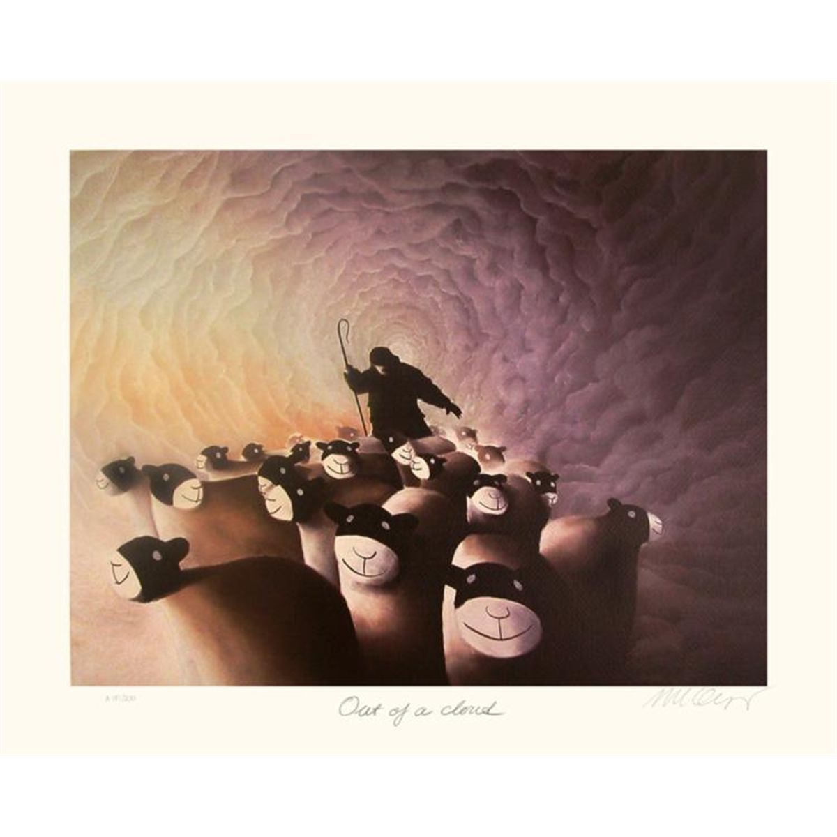 Artist: Mackenzie ThorpeTitle: Out of a CloudMedium: Lithograph on PaperOrientation: horizontalImage Size: 20 x 15.25 inchesPaper Size: 24 x 19.75 inchesEdition Size: 200: Signed by the artist, individually numbered, accompanied by certificate of authenticity signed by the publisher.Biography * Internationally renowned artist Mackenzie Thorpe was raised in the industrial town of Middlesbrough in the 1950s, where his father worked as a laborer and his mother as an auxiliary nurse. Mackenzie acknowledges mixed emotions about this period in his life. He remembers the strong feeling of community spirit, the warmth and humor that flourished in the face of adversity, as well as the loneliness and isolation. * The need and compulsion to draw was obvious from an early age and remains with Mackenzie today. As a child, he would seek out whatever raw materials he could find, drawing on cigarette packs with stubs of pencils, or using eye-shadow and lipstick illicitly obtained from his mum's makeup bag. Struggling with dyslexia throughout his childhood, Mackenzie found confidence in painting and drawing. Unsurprisingly, he left school without formal qualifications, taking on a variety of manual, unskilled jobs while continuing to draw and paint. Mackenzie eventually got the courage to enter the local art college. His lack of education and a barely readable application did nothing to warrant support, but the strength and volume of work that Mackenzie presented, coupled with his enthusiasm and commitment, won him a place at the Middlesbrough College of Art and, subsequently, the Byam Shaw School of Art in London. * After leaving art school, he spent several years working with inner-city children in London before moving to North Yorkshire to set up a studio and gallery with his wife, Susan, and children, Owen and Chloe. Since then, he has become one today's most collected and sought-after artists. His works express an entire range of human emotion, from the special bond of love and friendship, to the importance of self-reflection and individual triumphs. His works are a tribute to the creativity within us all and are a vivid expression of hope and the human spirit. * Mackenzie's perspective on life is clear. He doesn't hide the fact that often life is a struggle, a dark tunnel which can seem endless. However, he passionately believes that our frail dreams are worth nurturing and that love and honesty will triumph over adversity. *