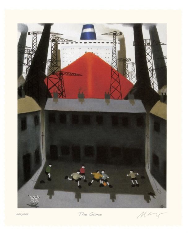 Artist: Mackenzie Thorpe Title: The Game Medium: Serigraph on paper Orientation: vertical Image size: 17 x 21.5 inches Paper size: 23.25 x 27.75 inches Edition size: 65 Hand-deckled EdgesThis hand-pulled serigraph Artist's Proof was printed on 100% cotton rag paper and was created with exceptional fine art craftsmanship. It has been hand-signed and hand-titled by the artist and is accompanied by a certificate of authenticity, signed by the publisher. BiographyInternationally renowned artist Mackenzie Thorpe was raised in the industrial town of Middlesbrough in the 1950s. Struggling from dyslexia throughout his childhood, Mackenzie found confidence in painting and drawing and eventually summoned the courage to go to art school. After leaving art school, he spent several years working with inner-city children in London before moving to North Yorkshire to set up a studio, as well as his own gallery. Since then, he has become one of the world's most collected and sought-after artists. His art works have been exhibited in museums and galleries across 4 continents.About the Artist - "My ambition is to unite the world through the eyes of these children and let today's cultures understand that in order to sustain our societies, we must protect and nurture our children, and also protect and nurture the child within us all. It is our responsibility to love these children, to let them bring love back to the world, and to keep our eyes open to the wonderment of childhood." - Mackenzie Thorpe