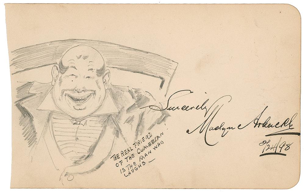 Cousin of comedian Roscoe "Fatty" Arbuckle. Original vintage signed pencil self-portrait on an off-white 7.5 x 4.75 album page, signed in fountain pen, “The real friend of the comedian is the man who laughs, Sincerely, Macklyn Arbuckle 2/24/98.” In fine condition, with a trimmed left edge, and some mild toning and soiling. Pre-certified PSA/DNA and RRAuction COA.