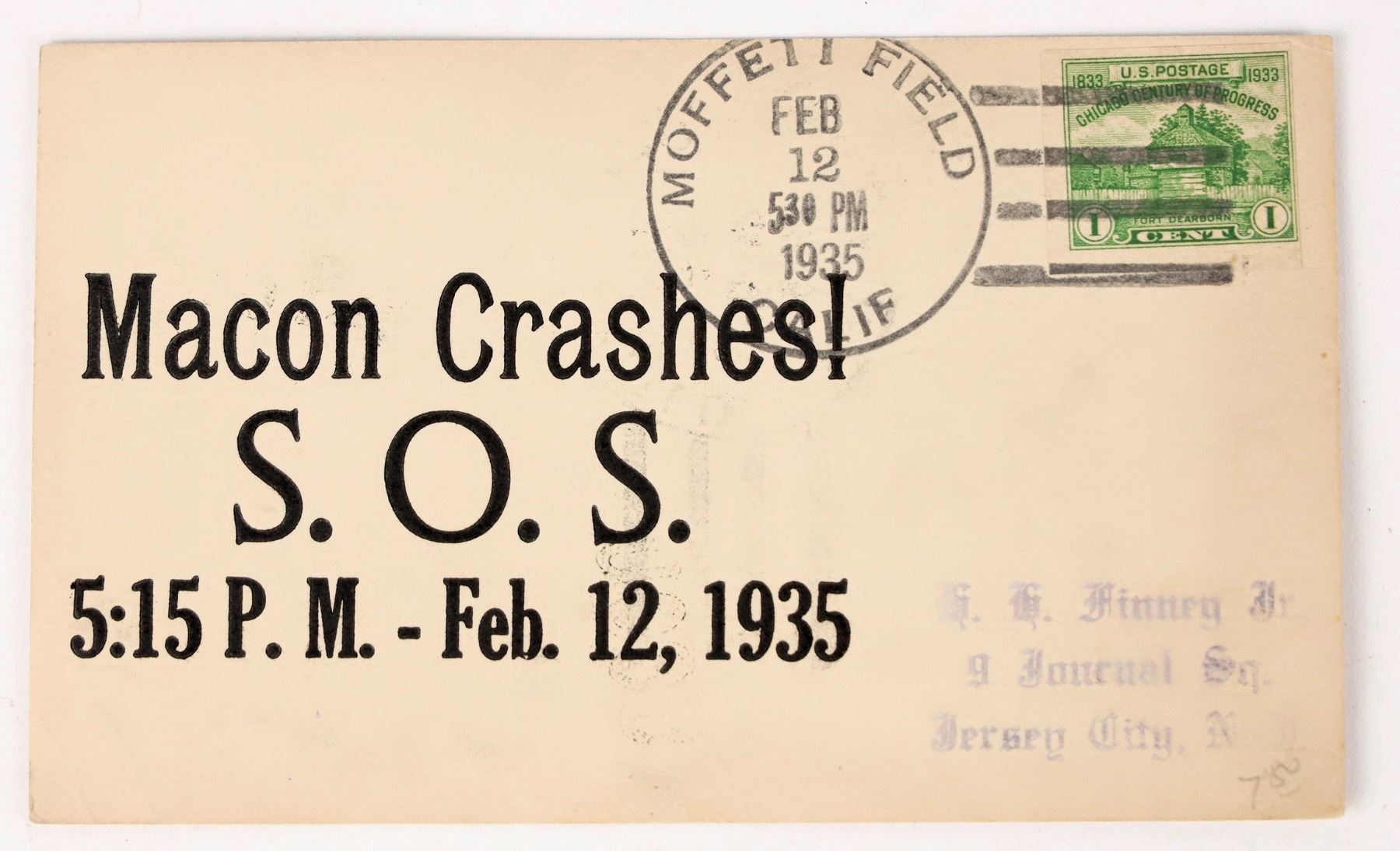 Post card dated the day and time of the dirigible historic crash, February 12 1935. The massive Naval airship was 785' long, and suffered a structural failure, lost buoyancy and subsequently crashed off Point Sur in a severe storm. Remarkably, all but (2) of the 85 servicemen survived. The cancellation stamp bears the time of 5:30 PM. Rare!