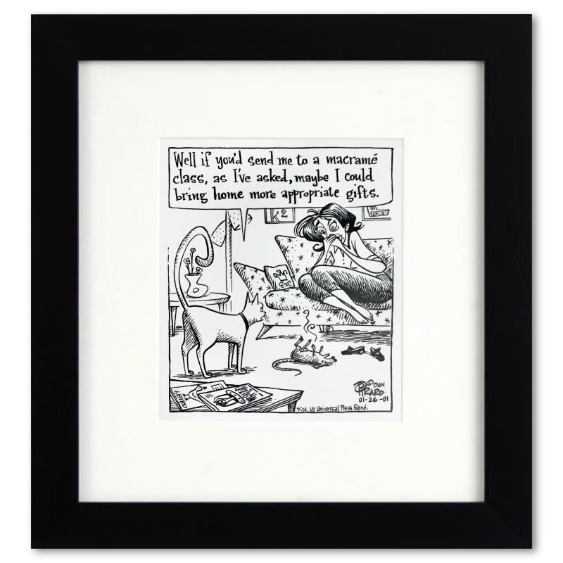 Enter a surreal and satirical world of twisted imagination and award winning creativity. "Macrame Class" is an original pen & ink drawing on paper by Dan Piraro, creator of the critically acclaimed and award winning comic strip, Bizarro. This piece is hand signed, comes custom framed and includes a letter of authenticity. Measures approximately 12" x 11" (frame), 7" x 6" (image).This item requires special handling and may have a longer than usual turnaround.