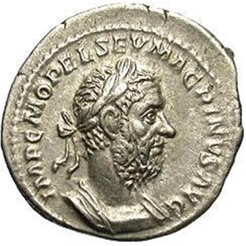 <B>Macrinus.</B></I> A.D. 217-218. AR denarius (20 mm, 2.86 g). Rome. Laureate and cuirassed bust right, with long beard / Fides standing front, head right, foot on helmet, holding standard in each hand. RIC 67; Clay Issue 2; RSC 23c. Nice VF.