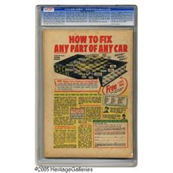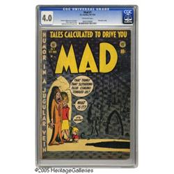 <B>Mad #1 (EC, 1952) CGC VG 4.0 Off-white pages.</B></I> The first satire comic book, <B>Mad</B></I> #1 was also one of the most influential comics of all time... and one of the funniest. Harvey Kurtzman's cover got the title off to a great start and also started the obsession with the name Melvin that would continue for many an issue. Publisher Gaines was known for assembling the best artists available, and he certainly did so here, with Wally Wood, Jack Davis, Bill Elder, and John Severin contributing. Overstreet 2004 VG 4.0 value = $1,000. CGC census 1/05: 7 in 4.0, 76 higher.