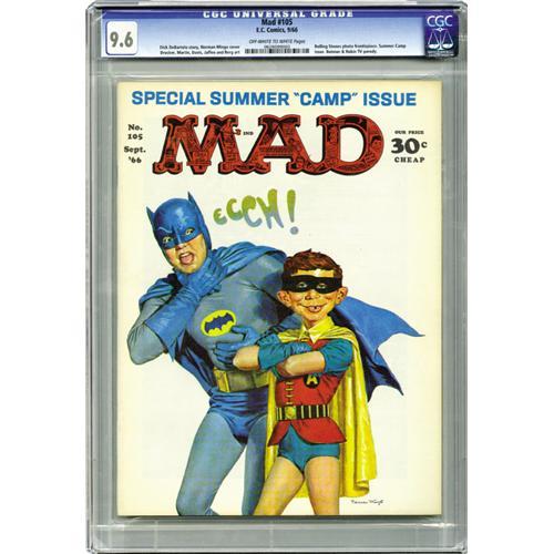 <B>Mad #105 (EC, 1966) CGC NM+ 9.6 Off-white to white pages.</B></I> This is the most sought-after of the <B>Mad</B></I> issues numbered #100-and-up, and no wonder: it's got a "Batman" cover and parody! The issue has a Norman Mingo cover, with interior art by Mort Drucker, Don Martin, Jack Davis, Al Jaffee, and Dave Berg. You'll be dancing the Batusi if you're the winning bidder, because this copy has the highest grade that CGC has assigned. Overstreet 2006 NM- 9.2 value = $50. CGC census 4/06: 4 in 9.6, none higher.