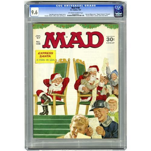 <B>Mad #108 (EC, 1967) CGC NM+ 9.6 Off-white to white pages.</B></I> Christmas cover by Norman Mingo. Mort Drucker, Don Martin, Al Jaffee, Jack Davis, and Dave Berg art. Overstreet 2006 NM- 9.2 value = $42. CGC census 4/06: 2 in 9.6, 2 higher.
