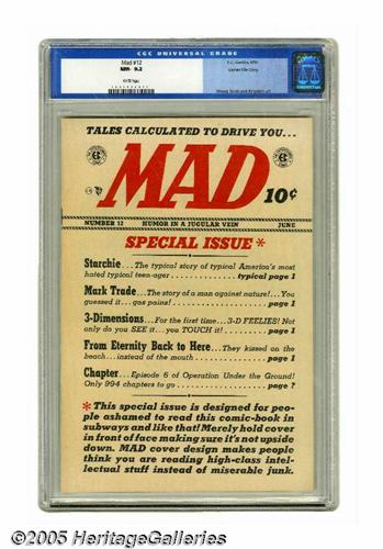 <B>Mad #12 Gaines File pedigree 6/12 (EC, 1954) CGC NM- 9.2 White pages.</B></I> With an Archie parody from Bill Elder and a "From Here To Eternity" parody from Bernie Krigstein, this issue provided plenty of yucks. EC stalwarts Wally Wood and Jack Davis contribute as well. One of the select copies from William Gaines' vaults. Overstreet 2005 NM- 9.2 value = $675. CGC census 3/05: 4 in 9.2, 5 higher.