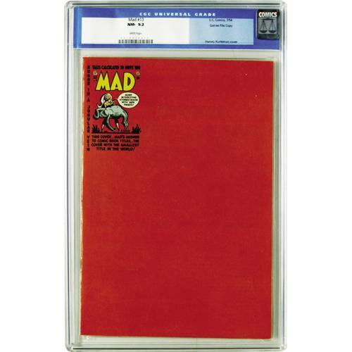 <B>Mad #13 Gaines File pedigree 8/12 (EC, 1954) CGC NM- 9.2 White pages.</B></I> This issue's micro-cover design features Harvey Kurtzman's twist on an old theme; this time, the girl is holding the gorilla! Interior art is supplied by Wally Wood, Jack Davis, and Bill Elder. Overstreet 2006 NM- 9.2 value = $725. CGC census 5/06: 2 in 9.2, 3 higher. <BR><BR><B>Important notice:</B> Heritage usually auctions material at the rate of 200-250 lots per hour. On some occasions eBay Live bid software or the Internet may not be able to keep up with the pace of the auction. We recommend placing a realistic absentee bid now as insurance to avoid disappointment. Occasionally the auctioneer may eliminate or reject an eBay Live bid, and the auctioneer may also reopen a lot after the close of the eBay live bidding (usually because we missed an audience bid), and may reject your bid even if it shows you as the winning bidder. By bidding via eBay Live, you agree that Heritage may award the lot to another bidder at its sole discretion under the circumstances described above or any other reasonable circumstances. Since eBay bids are not shown to us until we open the lot on the floor, we treat those bids just like floor bids. In most cases the floor responds before the eBay bid is presented to us, due to Internet lag time, so for consistency we have made it a policy that floor bids are always considered first over tie eBay live bids. Also please note that all Heritage lots purchased through eBay Live carry a 22.5% Buyer's Premium. Please make sure you read the Terms and Conditions before you bid. This lot is being auctioned in conjunction with a live floor auction by Heritage Auction Galleries. All final auction and invoice information will be supplied by Heritage Auction Galleries, and all other information should be considered preliminary. Lot:41001 <BR><BR><B>Winning Notification and Billing:</B> After the FINAL session in this auction is complete, Heritage will send e-mail and snail mail invoices. This process normally takes several days. All final auction and invoice information will be supplied by Heritage Auction Galleries, and all other information should be considered preliminary. <BR><BR>This auction will be conducted on a live auction floor and over the Internet through eBay Live. If you choose to place an absentee bid, please take a moment to <font color='#0000ff'><u><a href='http://pages.ebay.com/liveauctions/help/before/laabsentee.html'>learn how eBay Live absentee bidding works</a></u></font><font color='#000000'>