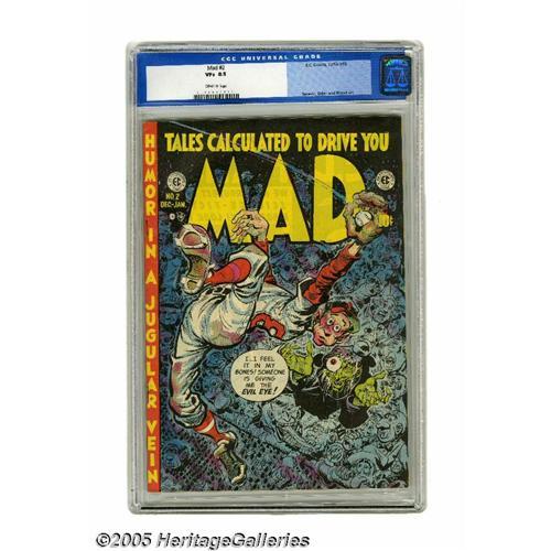 <B>Mad #2 (EC, 1952) CGC VF+ 8.5 Off-white pages.</B></I> We're all used to the " "<B>Mad</B></I> style of humor by now, but back in 1952 there was nothing on the stands quite like this. Jack Davis' cover combined horror, humor, and baseball (as did the accompanying story). Another highlight is the John Severin-drawn Tarzan parody ""Melvin!"". Bill Elder and Wally Wood joined the fun by working under the pen names <I>Melvin</B></I> Elder and <I>Melvin</B></I> Wood for this issue. Overstreet 2005 VF 8.0 value = $908; VF/NM 9.0 value = $1,329. CGC census 6/05: 5 in 8.5, 13 higher. <BR><BR><B>Important notice:</B> Heritage usually auctions material at the rate of 200-250 lots per hour. On some occasions eBay Live bid software or the Internet may not be able to keep up with the pace of the auction. We recommend placing a realistic absentee bid now as insurance to avoid disappointment. Occasionally the auctioneer may eliminate or reject an eBay Live bid, and the auctioneer may also reopen a lot after the close of the eBay live bidding (usually because we missed an audience bid), and may reject your bid even if it shows you as the winning bidder. By bidding via eBay Live, you agree that Heritage may award the lot to another bidder at its sole discretion under the circumstances described above or any other reasonable circumstances. Since eBay bids are not shown to us until we open the lot on the floor, we treat those bids just like floor bids. In most cases the floor responds before the eBay bid is presented to us, due to Internet lag time, so for consistency we have made it a policy that floor bids are always considered first over tie eBay live bids. Also please note that all Heritage lots purchased through eBay Live carry a 20% Buyer's Premium. Please make sure you read the Terms and Conditions before you bid. This lot is being auctioned in conjunction with a live floor auction by Heritage Galleries & Auctioneers. All final auction and invoice information will be suppli