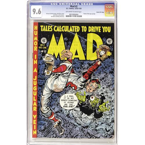<B>Mad #2 Gaines File pedigree 3/12 (EC, 1952) CGC NM+ 9.6 Off-white to white pages.</B></I> The legions of <B>Mad</B></I> collectors out there will love this top-grade copy of the comic's second issue. This ish has the only Jack Davis cover of the 23 comic book issues, and he didn't hold back on this horror-tinged baseball scene. Inside the book is the John Severin-drawn Tarzan parody "Melvin!" plus the work of Bill Elder and Wally Wood, and more by Davis too. Overstreet 2006 NM- 9.2 value = $1,800. CGC census 6/06: 4 in 9.6, 2 higher. <BR><BR><B>Important notice:</B> Heritage usually auctions material at the rate of 200-250 lots per hour. On some occasions eBay Live bid software or the Internet may not be able to keep up with the pace of the auction. We recommend placing a realistic absentee bid now as insurance to avoid disappointment. Occasionally the auctioneer may eliminate or reject an eBay Live bid, and the auctioneer may also reopen a lot after the close of the eBay live bidding (usually because we missed an audience bid), and may reject your bid even if it shows you as the winning bidder. By bidding via eBay Live, you agree that Heritage may award the lot to another bidder at its sole discretion under the circumstances described above or any other reasonable circumstances. Since eBay bids are not shown to us until we open the lot on the floor, we treat those bids just like floor bids. In most cases the floor responds before the eBay bid is presented to us, due to Internet lag time, so for consistency we have made it a policy that floor bids are always considered first over tie eBay live bids. Also please note that all Heritage lots purchased through eBay Live carry a 22.5% Buyer's Premium. Please make sure you read the Terms and Conditions before you bid. This lot is being auctioned in conjunction with a live floor auction by Heritage Auction Galleries. All final auction and invoice information will be supplied by Heritage Auction Galleries, and all other information should be considered preliminary. Lot:41001 <BR><BR><B>Winning Notification and Billing:</B> After the FINAL session in this auction is complete, Heritage will send e-mail and snail mail invoices. This process normally takes several days. All final auction and invoice information will be supplied by Heritage Auction Galleries, and all other information should be considered preliminary. <BR><BR>This auction will be conducted on a live auction floor and over the Internet through eBay Live. If you choose to place an absentee bid, please take a moment to <font color='#0000ff'><u><a href='http://pages.ebay.com/liveauctions/help/before/laabsentee.html'>learn how eBay Live absentee bidding works</a></u></font><font color='#000000'>
