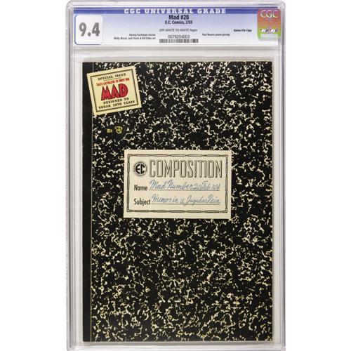 <B>Mad #20 Gaines File pedigree 4/12 (EC, 1955) CGC NM 9.4 Off-white to white pages.</B></I> Here's another hit copy from William Gaines' files. This issue featured a "Composition" notebook cover (designed to sneak into class), a Paul Revere poem parody, and a Katzenjammer Kids parody. Wally Wood, Jack Davis, and Bill Elder did some of the interior. Overstreet 2006 NM- 9.2 value = $620. CGC census 10/06: 3 in 9.4, 2 higher.<BR><BR><b>Shipping:</b> Slabbed Comic (<a target="_blank" href="http://www.heritageauctions.com/common/shipping.php">view shipping information</a>)