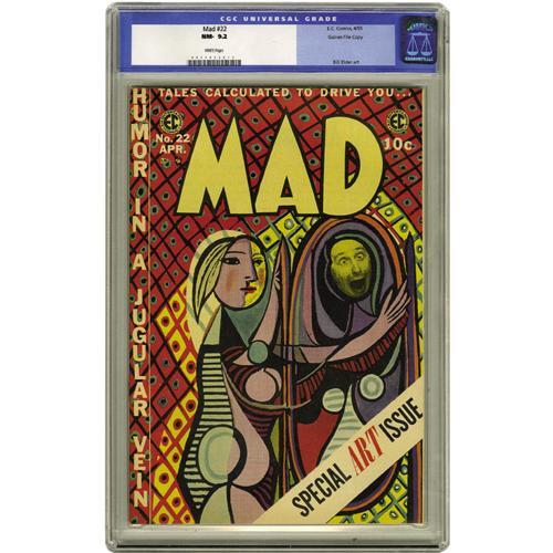 <B>Mad #22 Gaines File pedigree (EC, 1955) CGC NM- 9.2 White pages.</B></I> This is the notorious "Special art issue," with a Picasso-like cover by Harvey Kurtzman, and all interior art by Bill Elder. Although CGC recognizes this book as a Gaines File copy, no certificate accompanies this lot. Overstreet 2006 NM- 9.2 value = $620. CGC census 3/06: 2 in 9.2, 9 higher.