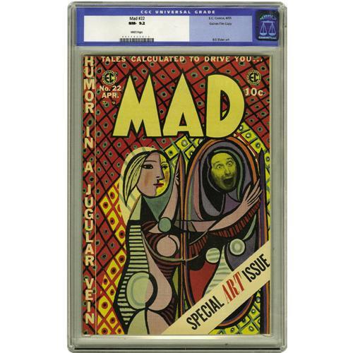 <B>Mad #22 Gaines File pedigree (EC, 1955) CGC NM- 9.2 White pages.</B></I> This is the notorious "Special art issue," with a Picasso-like cover by Harvey Kurtzman, and all interior art by Bill Elder. Although CGC recognizes this book as a Gaines File copy, no certificate accompanies this lot. Overstreet 2006 NM- 9.2 value = $620. CGC census 6/06: 2 in 9.2, 9 higher. <BR><BR><B>Important notice:</B> Heritage usually auctions material at the rate of 200-250 lots per hour. On some occasions eBay Live bid software or the Internet may not be able to keep up with the pace of the auction. We recommend placing a realistic absentee bid now as insurance to avoid disappointment. Occasionally the auctioneer may eliminate or reject an eBay Live bid, and the auctioneer may also reopen a lot after the close of the eBay live bidding (usually because we missed an audience bid), and may reject your bid even if it shows you as the winning bidder. By bidding via eBay Live, you agree that Heritage may award the lot to another bidder at its sole discretion under the circumstances described above or any other reasonable circumstances. Since eBay bids are not shown to us until we open the lot on the floor, we treat those bids just like floor bids. In most cases the floor responds before the eBay bid is presented to us, due to Internet lag time, so for consistency we have made it a policy that floor bids are always considered first over tie eBay live bids. Also please note that all Heritage lots purchased through eBay Live carry a 22.5% Buyer's Premium. Please make sure you read the Terms and Conditions before you bid. This lot is being auctioned in conjunction with a live floor auction by Heritage Auction Galleries. All final auction and invoice information will be supplied by Heritage Auction Galleries, and all other information should be considered preliminary. Lot:41001 <BR><BR><B>Winning Notification and Billing:</B> After the FINAL session in this auction is complete, Heritage will send e-mail and snail mail invoices. This process normally takes several days. All final auction and invoice information will be supplied by Heritage Auction Galleries, and all other information should be considered preliminary. <BR><BR>This auction will be conducted on a live auction floor and over the Internet through eBay Live. If you choose to place an absentee bid, please take a moment to <font color='#0000ff'><u><a href='http://pages.ebay.com/liveauctions/help/before/laabsentee.html'>learn how eBay Live absentee bidding works</a></u></font><font color='#000000'>