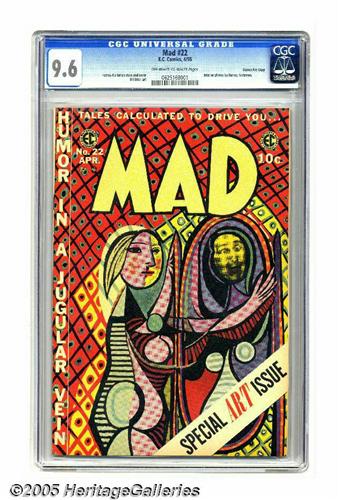 <B>Mad #22 Gaines File pedigree (EC, 1955) CGC NM+ 9.6 Off-white to white pages.</B></I> This "Special art issue" is a rare single-artist <B>Mad</B></I>, with Bill Elder supplying all of the issue's interior art (that's Elder wigging out on the cover, too). The Picasso-esque cover is by Harvey Kurtzman. Only one copy of this issue has been certified with a higher grade by CGC to date. Note that while CGC has certified this comic as a Gaines File Copy, no certificate accompanies this lot. Overstreet 2005 NM- 9.2 value = $575. CGC census 6/05: 2 in 9.6, 1 higher.