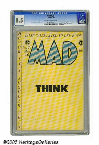 <B>Mad #23 (EC, 1955) CGC VF+ 8.5 Off-white to white pages.</B></I> Last comic book issue of <B>Mad</B></I>. Wally Wood and Jack Davis art. Overstreet 2005 VF 8.0 value = $300; VF/NM 9.0 value = $438. CGC census 7/05: 3 in 8.5, 5 higher.