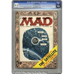 <B>Mad #26 (EC, 1955) CGC NM- 9.2 Cream to off-white pages.</B></I> This third magazine-sized issue of <B>Mad</B></I> is notable for a spoof of Marilyn Monroe's "Seven Year Itch" movie. Harvey Kurtzman was still writing and editing (his last issue would be #28), and art chores were handled by Wally Wood, Jack Davis, and Will Elder. Ernie Kovacs contributed a text piece, and Al Jaffee was also featuring as a writer (his art would begin appearing with the next issue.) Overstreet 2004 NM- 9.2 value = $475. <BR><BR><B>Important notice:</B> Heritage usually auctions material at the rate of 200-250 lots per hour. On some occasions eBay Live bid software or the Internet may not be able to keep up with the pace of the auction. We recommend placing a realistic absentee bid now as insurance to avoid disappointment. Occasionally the auctioneer may eliminate or reject an eBay Live bid, and the auctioneer may also reopen a lot after the close of the eBay live bidding (usually because we missed an audience bid), and may reject your bid even if it shows you as the winning bidder. By bidding via eBay Live, you agree that Heritage may award the lot to another bidder at its sole discretion under the circumstances described above or any other reasonable circumstances. Since eBay bids are not shown to us until we open the lot on the floor, we treat those bids just like floor bids. In most cases the floor responds before the eBay bid is presented to us, due to Internet lag time, so for consistency we have made it a policy that floor bids are always considered first over tie eBay live bids. Also please note that all Heritage lots purchased through eBay Live carry a 20% Buyer's Premium. Please make sure you read the Terms and Conditions before you bid. </span></font></tr></table></td></tr></table>