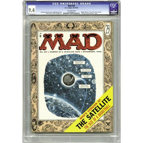 <B>Mad #26 (EC, 1955) CGC NM 9.4 Off-white pages.</B></I> The men of <B>Mad</B></I> satirize "The Seven Year Itch" with Marilyn Monroe (and don't forget Tom Ewell... okay, forget Tom Ewell)! The issue has a Wally Wood cover, with interior art by Wood, Jack Davis, Al Jaffee, and Bill Elder. Overstreet 2006 NM- 9.2 value = $600. CGC census 4/06: 5 in 9.4, 1 higher.