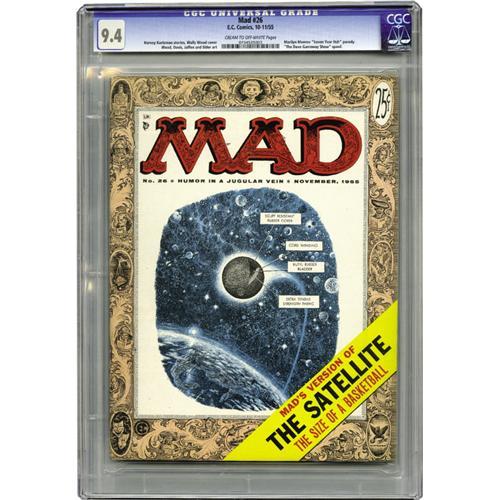 <B>Mad #26 (EC, 1955) CGC NM 9.4 Cream to off-white pages.</B></I> A Marilyn Monroe "Seven Year Itch" parody appears inside this book with a Harvey Kurtzman cover logo and outrageous border. The amazing EC staff that contributes to the interior art includes Wally Wood, Jack Davis, Bill Elder, and Bernie Krigstein. This copy is in exceptional condition with sharp corners, a straight spine, and bright cover colors! Overstreet 2006 NM- 9.2 value = $600. CGC census 7/06: 6 in 9.4, 2 higher. <BR><BR><B>Important notice:<<BR><BR><B>Important notice:</B> Heritage usually auctions material at the rate of 200-250 lots per hour. On some occasions eBay Live bid software or the Internet may not be able to keep up with the pace of the auction. We recommend placing a realistic absentee bid now as insurance to avoid disappointment. Occasionally the auctioneer may eliminate or reject an eBay Live bid, and the auctioneer may also reopen a lot after the close of the eBay live bidding (usually because we missed an audience bid), and may reject your bid even if it shows you as the winning bidder. By bidding via eBay Live, you agree that Heritage may award the lot to another bidder at its sole discretion under the circumstances described above or any other reasonable circumstances. Since eBay bids are not shown to us until we open the lot on the floor, we treat those bids just like floor bids. In most cases the floor responds before the eBay bid is presented to us, due to Internet lag time, so for consistency we have made it a policy that floor bids are always considered first over tie eBay live bids. Also please note that all Heritage lots purchased through eBay Live carry a 22.5% Buyer's Premium. Please make sure you read the Terms and Conditions before you bid. This lot is being auctioned in conjunction with a live floor auction by Heritage Auction Galleries. All final auction and invoice information will be supplied by Heritage Auction Galleries, and all other information should be considered preliminary. Lot:41001 <BR><BR><B>Winning Notification and Billing:</B> After the FINAL session in this auction is complete, Heritage will send e-mail and snail mail invoices. This process normally takes several days. All final auction and invoice information will be supplied by Heritage Auction Galleries, and all other information should be considered preliminary. <BR><BR>This auction will be conducted on a live auction floor and over the Internet through eBay Live. If you choose to place an absentee bid, please take a moment to <font color='#0000ff'><u><a href='http://pages.ebay.com/liveauctions/help/before/laabsentee.html'>learn how eBay Live absentee bidding works</a></u></font><font color='#000000'>