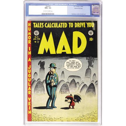 <B>Mad #3 Gaines File pedigree 8/12 (EC, 1953) CGC NM+ 9.6 Off-white to white pages.</B></I> No copy of this issue has been graded higher by CGC to date! It's a memorable issue, too. Some remember it best for the story with a statuesque beauty (and by "statuesque" we mean "Wally Wood") alone in the dark. Others would give the nod to the parody "Lone Stranger," drawn by Jack Davis. Other highlights include "Dragged Net" by Bill Elder, a French Foreign Legion tale drawn by John Severin, and Harvey Kurtzman cover art. The first five issues of <B>Mad</B></I> are the toughest ones to get your hands on, and to have one from the files of <B>Mad</B></I> boss Bill Gaines is particularly thrilling. Overstreet 2006 NM- 9.2 value = $1,175. CGC census 6/06: 6 in 9.6, none higher. <BR><BR><B>Important notice:</B> Heritage usually auctions material at the rate of 200-250 lots per hour. On some occasions eBay Live bid software or the Internet may not be able to keep up with the pace of the auction. We recommend placing a realistic absentee bid now as insurance to avoid disappointment. Occasionally the auctioneer may eliminate or reject an eBay Live bid, and the auctioneer may also reopen a lot after the close of the eBay live bidding (usually because we missed an audience bid), and may reject your bid even if it shows you as the winning bidder. By bidding via eBay Live, you agree that Heritage may award the lot to another bidder at its sole discretion under the circumstances described above or any other reasonable circumstances. Since eBay bids are not shown to us until we open the lot on the floor, we treat those bids just like floor bids. In most cases the floor responds before the eBay bid is presented to us, due to Internet lag time, so for consistency we have made it a policy that floor bids are always considered first over tie eBay live bids. Also please note that all Heritage lots purchased through eBay Live carry a 22.5% Buyer's Premium. Please make sure you read the Terms and Conditions before you bid. This lot is being auctioned in conjunction with a live floor auction by Heritage Auction Galleries. All final auction and invoice information will be supplied by Heritage Auction Galleries, and all other information should be considered preliminary. Lot:41001 <BR><BR><B>Winning Notification and Billing:</B> After the FINAL session in this auction is complete, Heritage will send e-mail and snail mail invoices. This process normally takes several days. All final auction and invoice information will be supplied by Heritage Auction Galleries, and all other information should be considered preliminary. <BR><BR>This auction will be conducted on a live auction floor and over the Internet through eBay Live. If you choose to place an absentee bid, please take a moment to <font color='#0000ff'><u><a href='http://pages.ebay.com/liveauctions/help/before/laabsentee.html'>learn how eBay Live absentee bidding works</a></u></font><font color='#000000'>