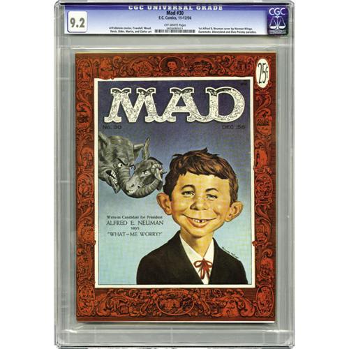<B>Mad #30 (EC, 1956) CGC NM- 9.2 Off-white pages.</B></I> While the face of Alfred E. Neuman as depicted here looks familiar now, this was the <I>first</B></I> depiction of the "What Me Worry Kid" by Norman Mingo, and this, not any previous version, is the one that all America recognizes as the characteristic Alfred. Thus we think this will continue to be one of the most-collected issues of the title. The issue has interior art by Jack Davis, Bill Elder, Don Martin, and Bob Clarke. Overstreet 2006 NM- 9.2 value = $675. CGC census 4/06: 1 in 9.2, 2 higher.