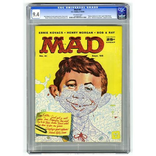 <B>Mad #41 (EC, 1958) CGC NM 9.4 Off-white pages.</B></I> Kelly Freas cover. Mell Lazarus, Wally Wood, Joe Orlando, Don Martin, Dave Berg, and Mort Drucker art. Overstreet 2006 NM- 9.2 value = $175. CGC census 5/06: 2 in 9.4, 3 higher. <BR><BR><B>Important notice:</B> Heritage usually auctions material at the rate of 200-250 lots per hour. On some occasions eBay Live bid software or the Internet may not be able to keep up with the pace of the auction. We recommend placing a realistic absentee bid now as insurance to avoid disappointment. Occasionally the auctioneer may eliminate or reject an eBay Live bid, and the auctioneer may also reopen a lot after the close of the eBay live bidding (usually because we missed an audience bid), and may reject your bid even if it shows you as the winning bidder. By bidding via eBay Live, you agree that Heritage may award the lot to another bidder at its sole discretion under the circumstances described above or any other reasonable circumstances. Since eBay bids are not shown to us until we open the lot on the floor, we treat those bids just like floor bids. In most cases the floor responds before the eBay bid is presented to us, due to Internet lag time, so for consistency we have made it a policy that floor bids are always considered first over tie eBay live bids. Also please note that all Heritage lots purchased through eBay Live carry a 22.5% Buyer's Premium. Please make sure you read the Terms and Conditions before you bid. This lot is being auctioned in conjunction with a live floor auction by Heritage Auction Galleries. All final auction and invoice information will be supplied by Heritage Auction Galleries, and all other information should be considered preliminary. Lot:41001 <BR><BR><B>Winning Notification and Billing:</B> After the FINAL session in this auction is complete, Heritage will send e-mail and snail mail invoices. This process normally takes several days. All final auction and invoice information will be supplied by Heritage Auction Galleries, and all other information should be considered preliminary. <BR><BR>This auction will be conducted on a live auction floor and over the Internet through eBay Live. If you choose to place an absentee bid, please take a moment to <font color='#0000ff'><u><a href='http://pages.ebay.com/liveauctions/help/before/laabsentee.html'>learn how eBay Live absentee bidding works</a></u></font><font color='#000000'>