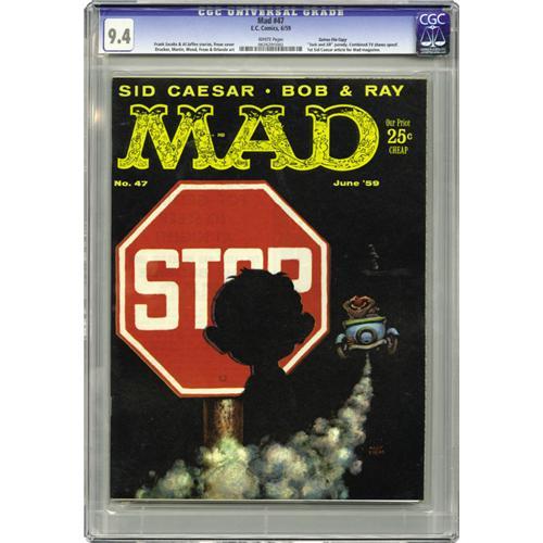 <B>Mad #47 Gaines File pedigree (EC, 1959) CGC NM 9.4 White pages.</B></I> Sid Caesar and Bob and Ray were awfully big names in comedy in the 1950s, and <B>Mad</B></I> scored quite a coup by getting them to contribute as writers. On the artistic front, this issue has the work of Kelly Freas (who painted the cover), Mort Drucker, Don Martin, Wally Wood, and Joe Orlando. Overstreet 2006 NM- 9.2 value = $175. CGC census 4/06: 2 in 9.4, 2 higher.