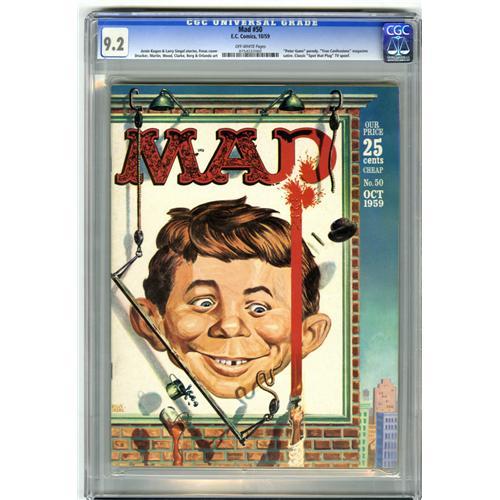 <B>Mad #50 (EC, 1959) CGC NM- 9.2 Off-white pages.</B></I> "Peter Gunn" parody. Kelly Freas cover. Mort Drucker, Don Martin, Wally Wood, Bob Clarke, Dave Berg, and Joe Orlando art. Overstreet 2006 NM- 9.2 value = $175. CGC census 4/06: 2 in 9.2, 4 higher.