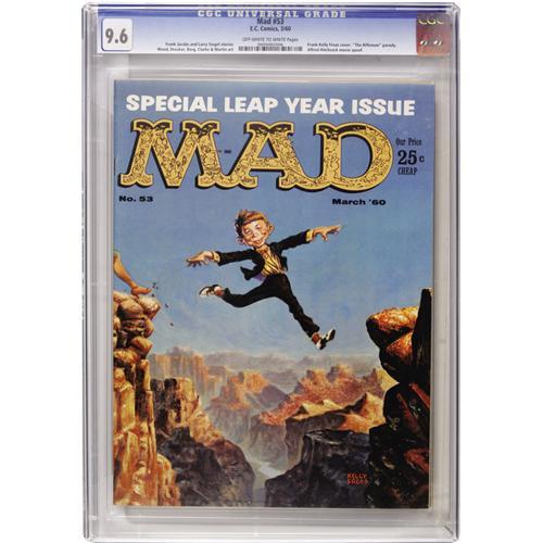 <B>Mad #53 (EC, 1960) CGC NM+ 9.6 Off-white to white pages.</B></I> Kelly Freas painted this issue's front and back covers, and the talented pens and pencils of Wally Wood, Mort Drucker, Dave Berg, Bob Clarke, and Don Martin did the rest. Overstreet 2006 NM- 9.2 value = $150. CGC census 3/07: 2 in 9.6, none higher. <I> From the Warren Hall Collection.</B></I><BR><BR><b>Shipping:</b> Comics - Slabbed (certified) (<a target="_blank" href="http://www.heritageauctions.com/common/shipping.php">view shipping information</a>)