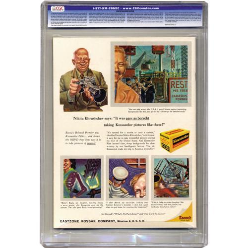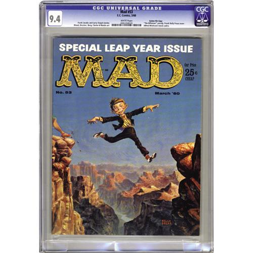 <B>Mad #53 Gaines File pedigree (EC, 1960) CGC NM 9.4 White pages.</B></I> Kelly Freas painted this issue's front and back covers, and the talented pens and pencils of Wally Wood, Mort Drucker, Dave Berg, Bob Clarke, and Don Martin did the rest. Overstreet 2006 NM- 9.2 value = $150. CGC census 3/06: 2 in 9.4, 2 higher.